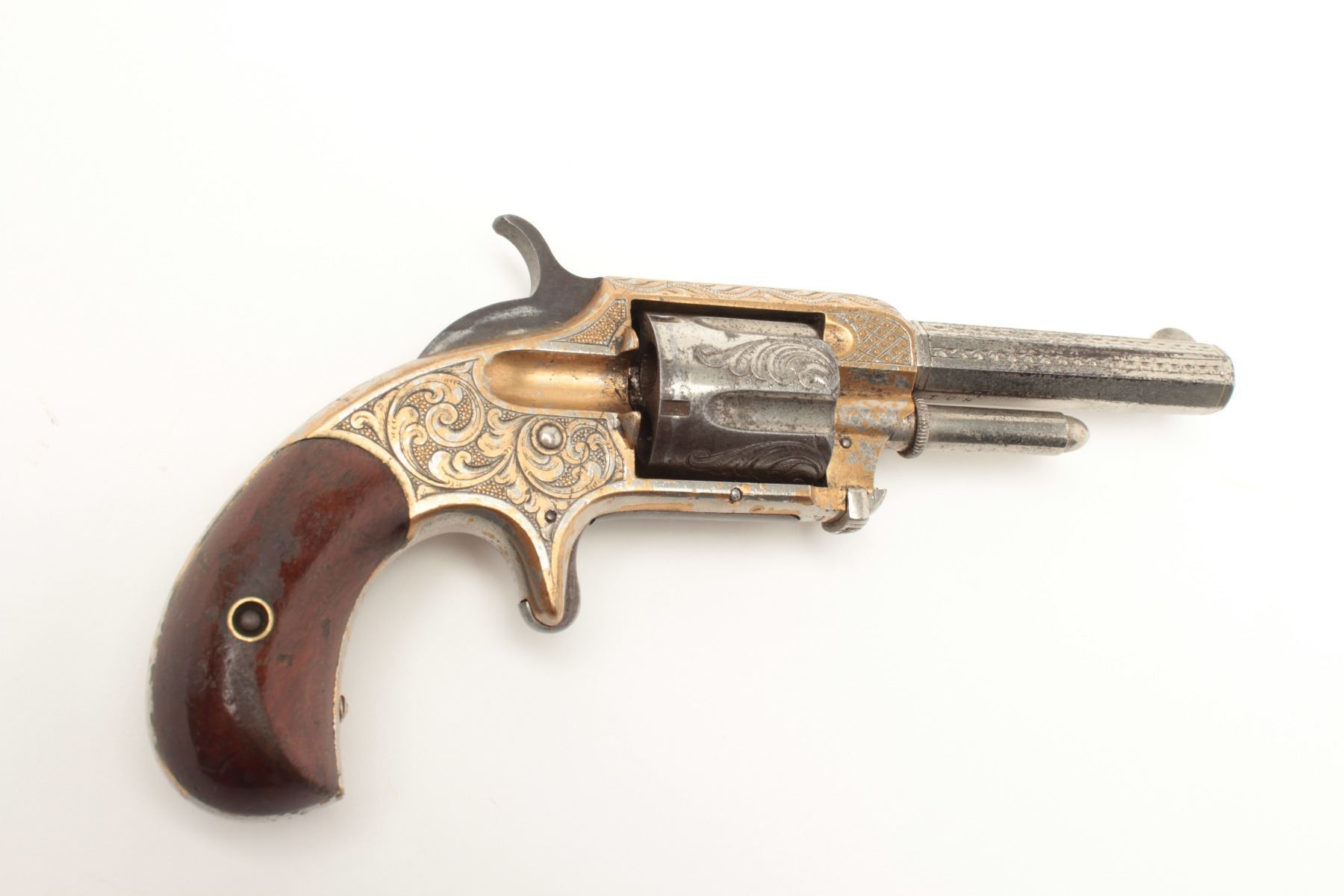 Whitneyville .32RF caliber spur trigger revolver, 3.25” octagon barrel, fully engraved, nickel finish, rosewood grips, 5-shot cylinder, deluxe New York engraving in Nimschke style. (Antique). From theWhitney family collection. Est.: $400-$800.