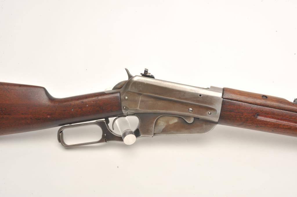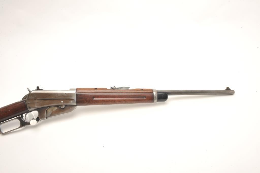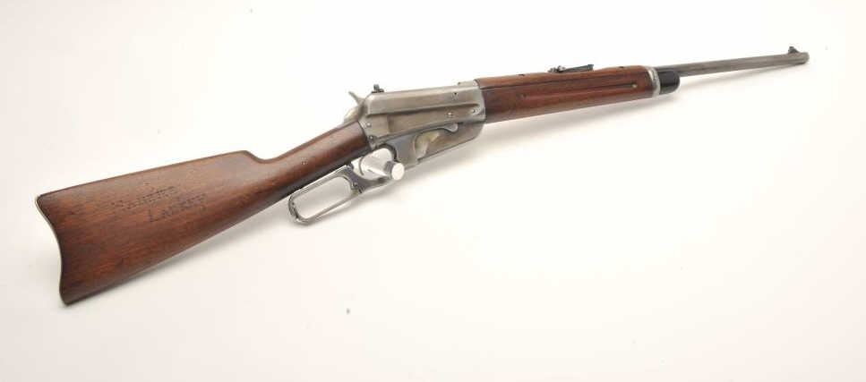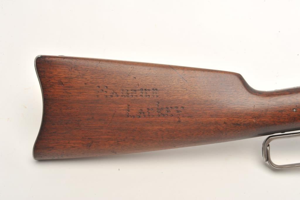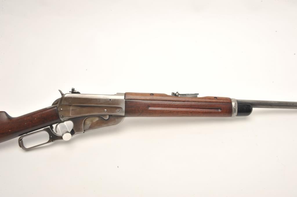 Winchester Model 1895 SRC, .30 Army caliber, 22” round barrel, blued finish, wood stocks with customized forend cap, S/N 86593, in overall good + condition displaying some original muted blue finish in protectedareas, good bore, crisp action, good markings, adjustable receiver mounted peep sight, overall good wood with several old pins at wrist area and what appears to be a name on the right side of the butt stock done in dot lettering “HA____ LARKEY” ? (C&R). Est.: $500-$1,000.