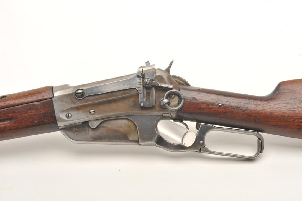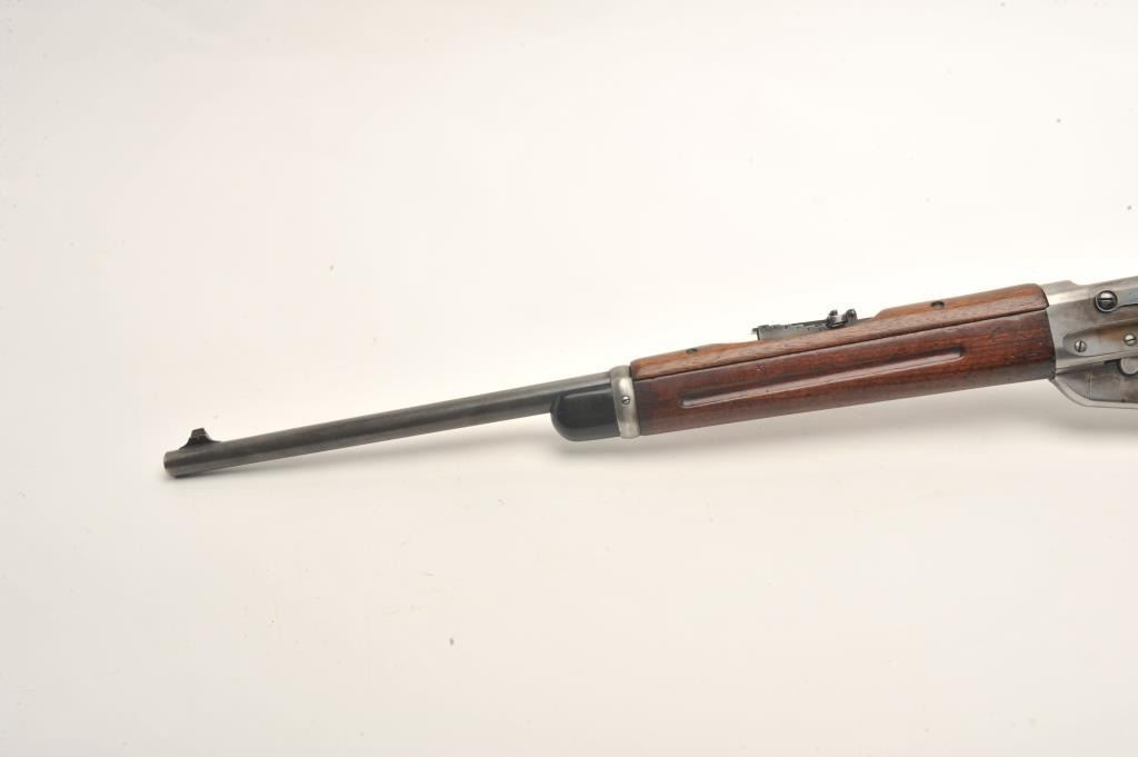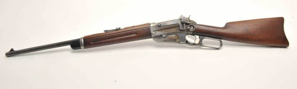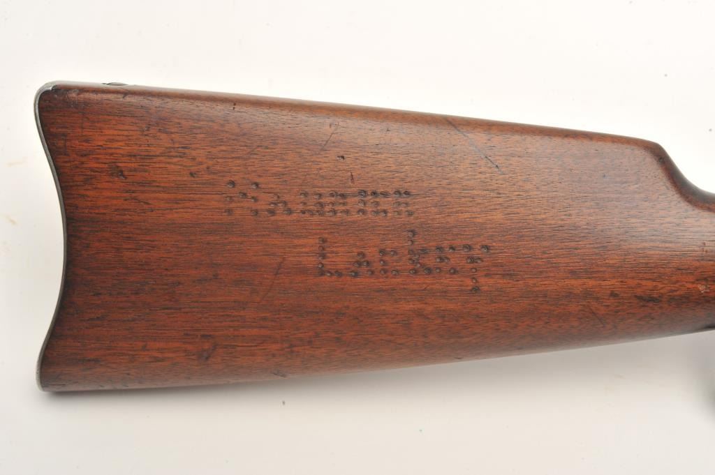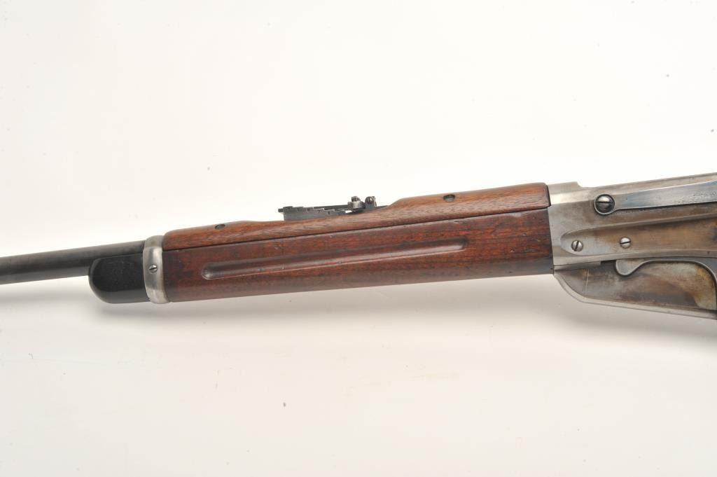 Winchester Model 1895 SRC, .30 Army caliber, 22” round barrel, blued finish, wood stocks with customized forend cap, S/N 86593, in overall good + condition displaying some original muted blue finish in protectedareas, good bore, crisp action, good markings, adjustable receiver mounted peep sight, overall good wood with several old pins at wrist area and what appears to be a name on the right side of the butt stock done in dot lettering “HA____ LARKEY” ? (C&R). Est.: $500-$1,000.