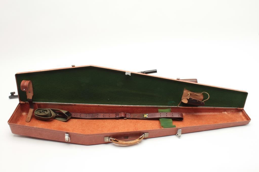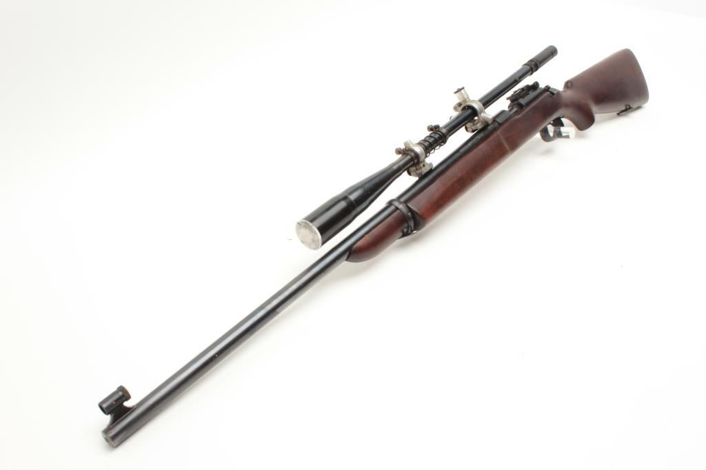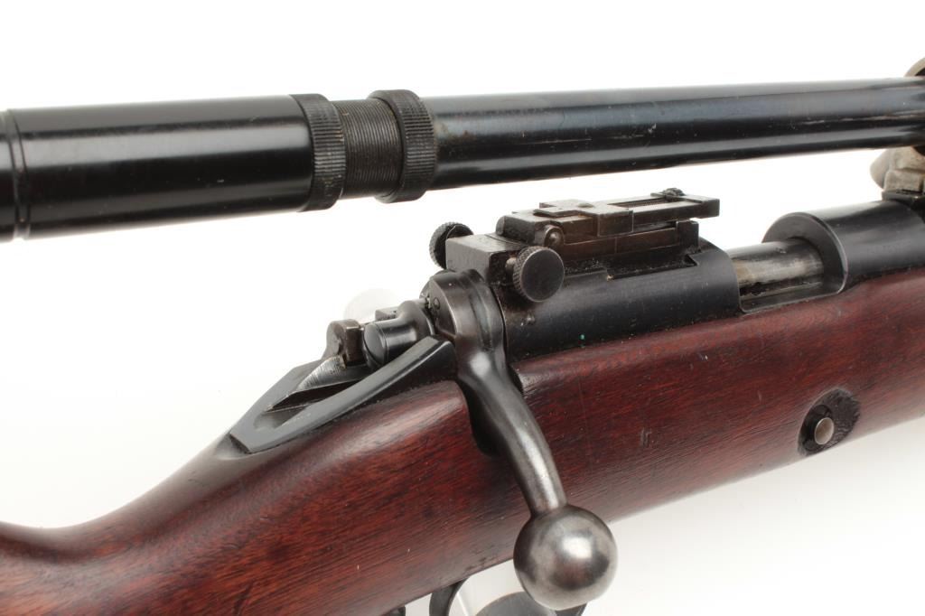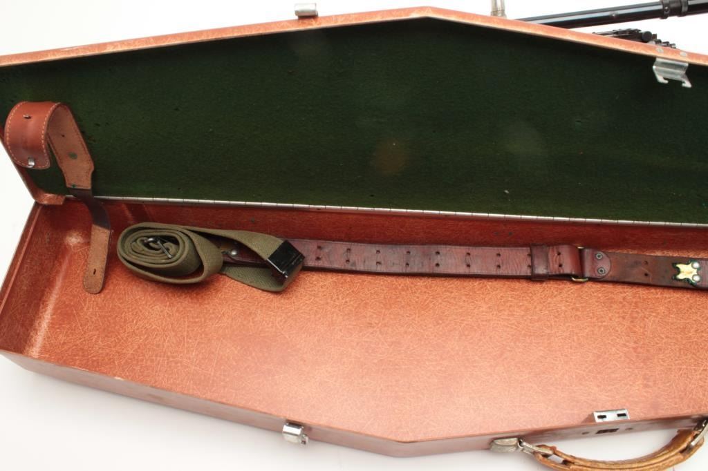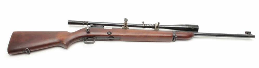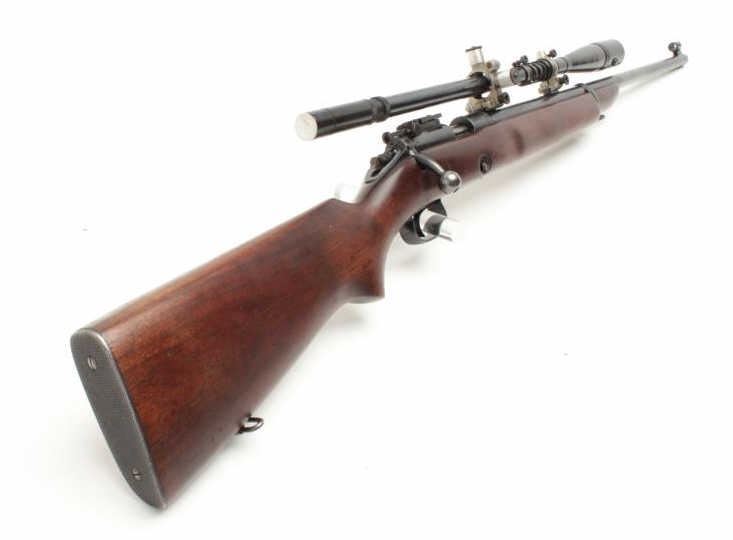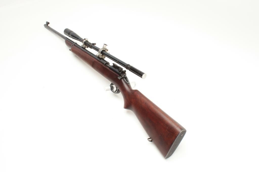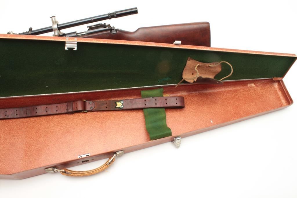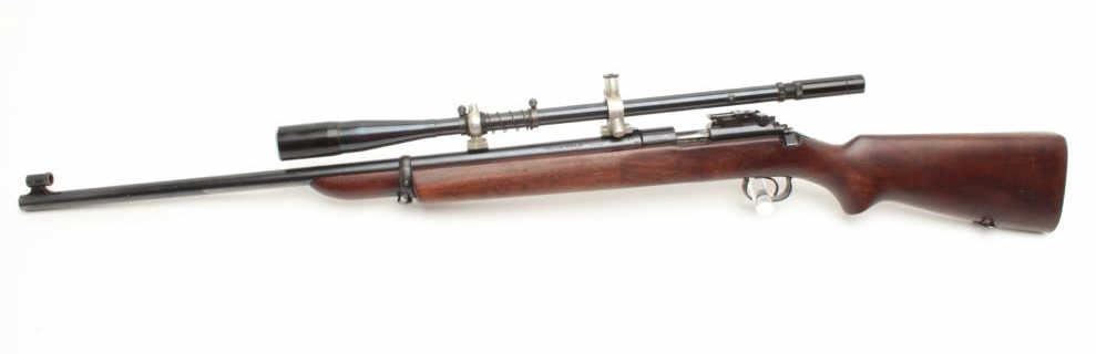 Winchester Model 52 bolt action target rifle, .22LR caliber, 28” barrel, blued finish, wood stock, S/N 23596, mounted with a Power 12 Spot Shot scope by R.A. Litschert displaying crisp optics; also included is asuitcase style carry case with 2 slings, extra inserts for hooded front sight and an extra magazine. This gun is in overall fine condition with majority of original finish remaining; fine bore, crisp action andmarkings, very good to fine stock. (C&R). Est.: $750-$1,500.