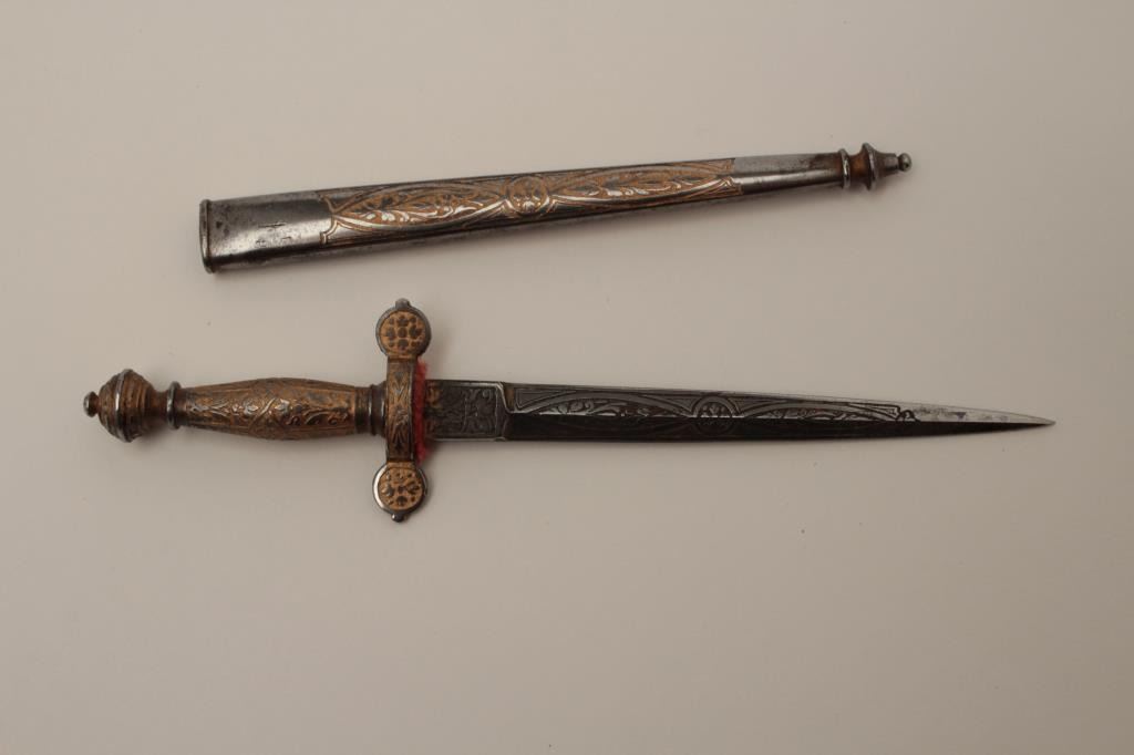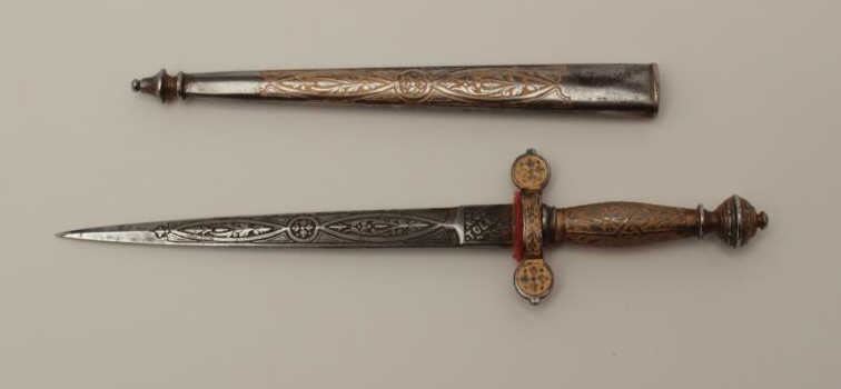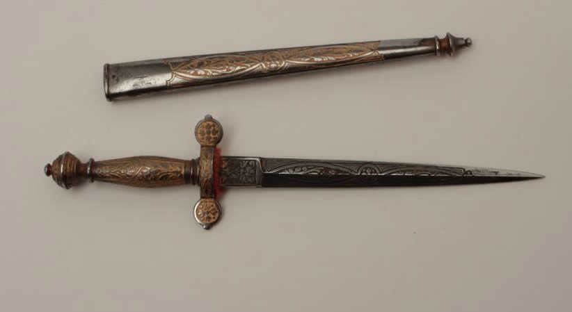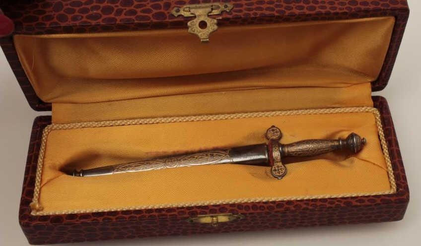 Lot 969 Miniature Toledo marked dagger in case. Etched and gilted. Measures 5 ½” overall with 3 ¾” blade.