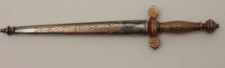 Miniature Toledo marked dagger in case. Etched and gilted. Measures 5 ½” overall with 3 ¾” blade. Archaic style and fine quality. 19th to early 20th century. In later associated casing. Est.: $400-$800