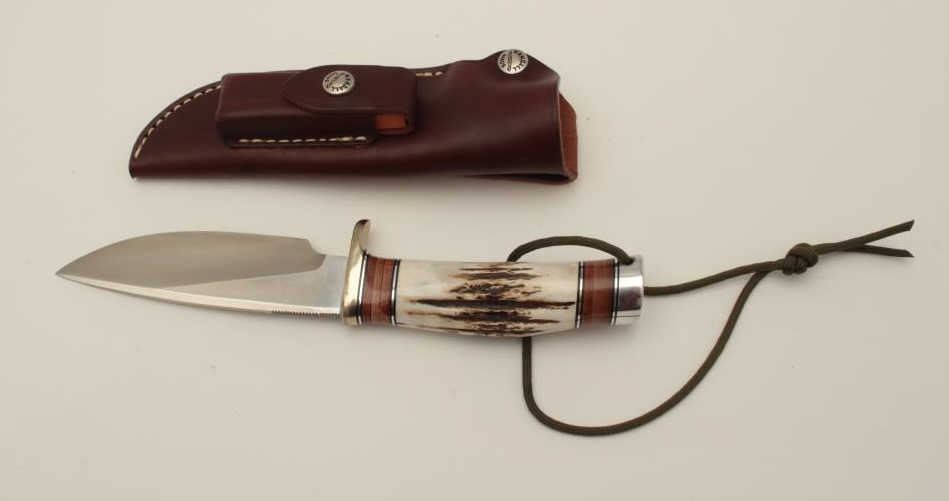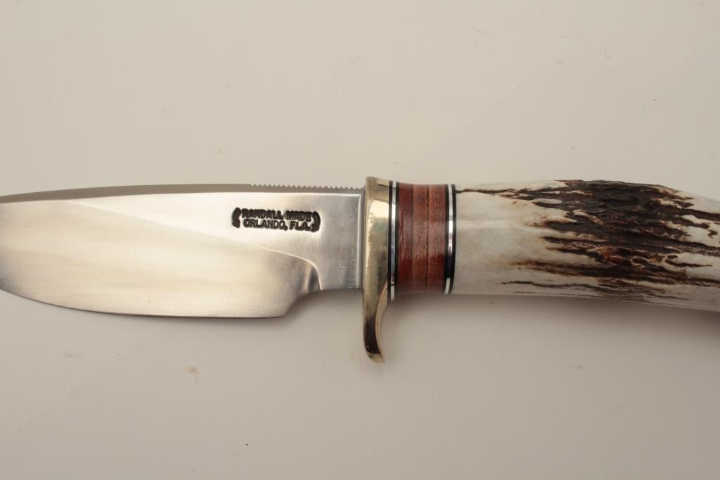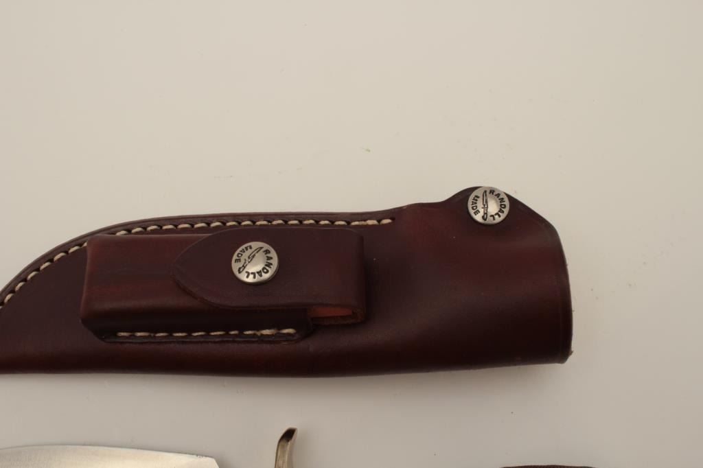 Randall Model 25-5” Trapper fixed blade knife with tool steel blade, nickel silver hilt, beautiful stag and leather handle, aluminum butt cap, thong hole and pouch style leather sheath with stone. The knife is like newwith only light storage marks. Featuring a 5” blade and 10” overall length. Why wait 4-5 years to get one from Randall. A great knife with outstanding stag scales. The original sales receipt from Nordic Knives isincluded with Randall paperwork. The lot also includes a new, Lansky Sharpeners Diamond Knife Sharpening System in the original plastic hard case. A great knife and new in the box sharpening system. Est.: $350-$700.