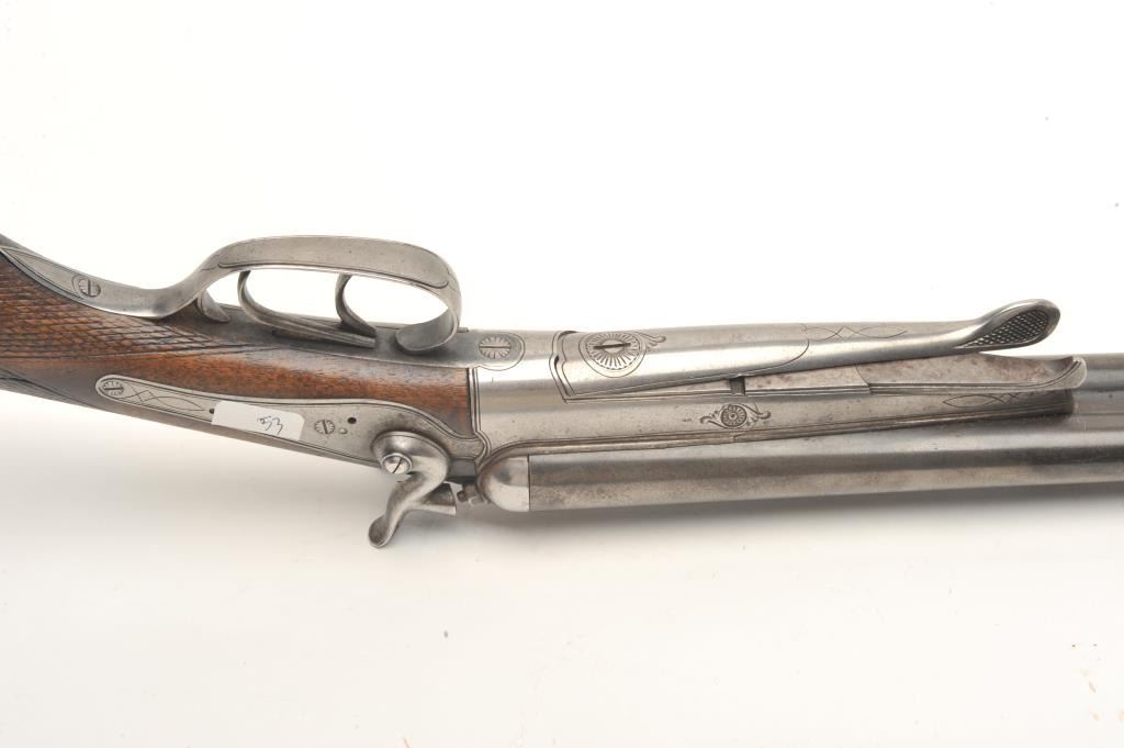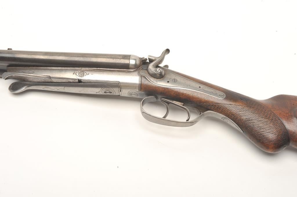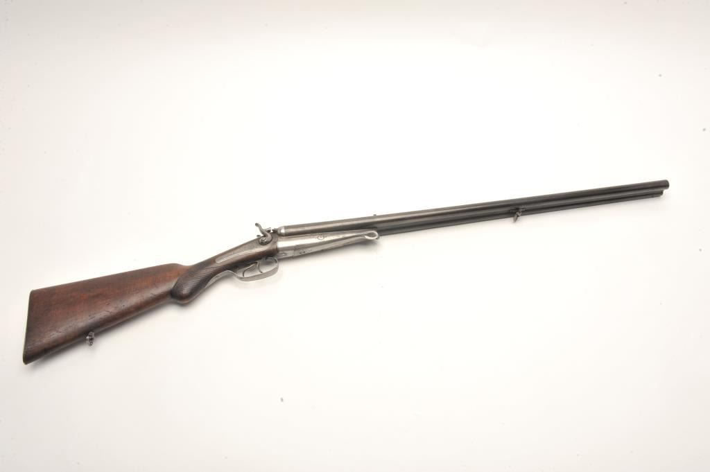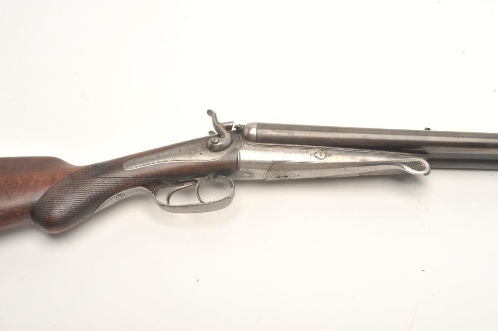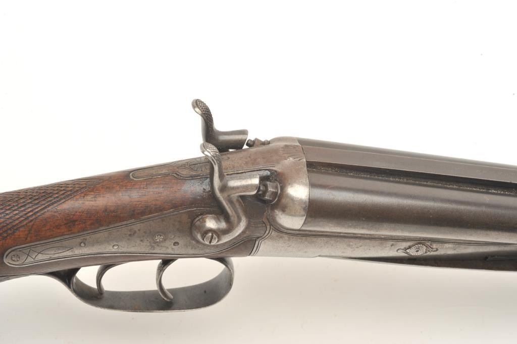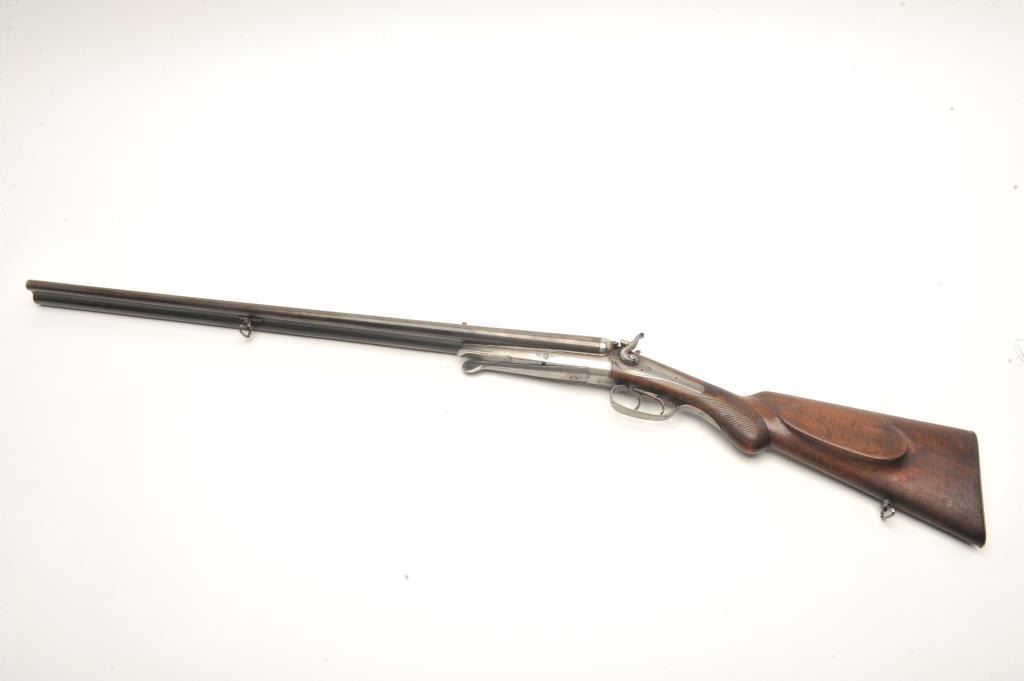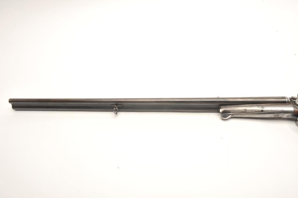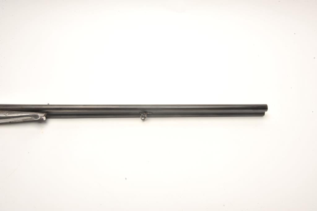 Antique Husquvarna Vapenfabrik signed cape gun in 16GA x 9mm rifle. Measures 45” overall with 28 ¾” barrels. Underlever release with exposed hammer. 75%-85% original blue on the barrels. Cleaning to bright action and locks with traces of case hardening. Good wood with minor aging. The bores are fair and may clean to good. Tight action. Est.: $600-$1200