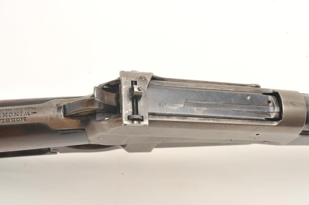 Lot 975 Winchester Model 95 lever action rifle, .30 Army caliber, 28” round barrel, blued finish, Lyman re