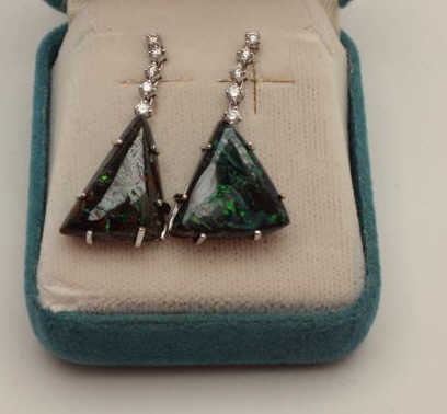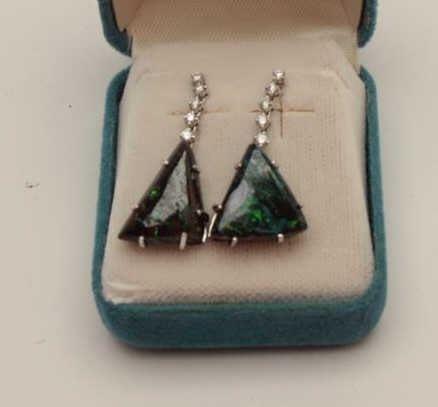 Lot 981 One pair of black opal earrings custom made in 18k white gold suspended by a row of diamonds .Est: