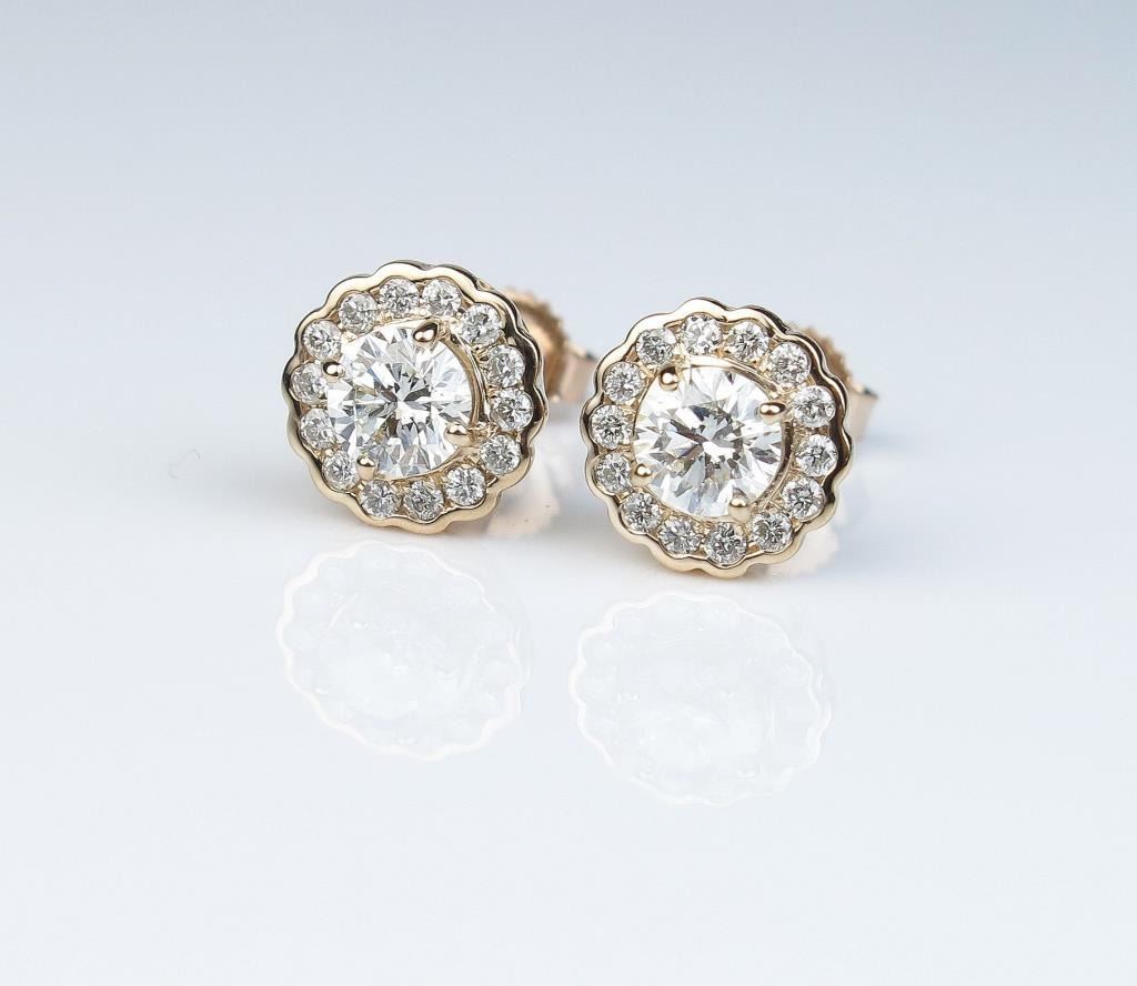 Very high quality ladies earrings with two ‘IDEAL’ cut diamonds weighing 0.75 carats of F-G colors and SI1 clarity with 28 side diamonds of F-G colors and VS/SI1 clarity combined weight of approx. 1.00 carat set in14 karat rose gold setting. Retail $3,000-$4,000 Estimates $2,000- $3,000 Nice