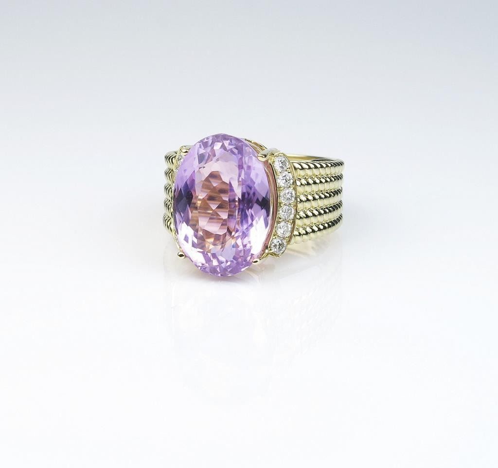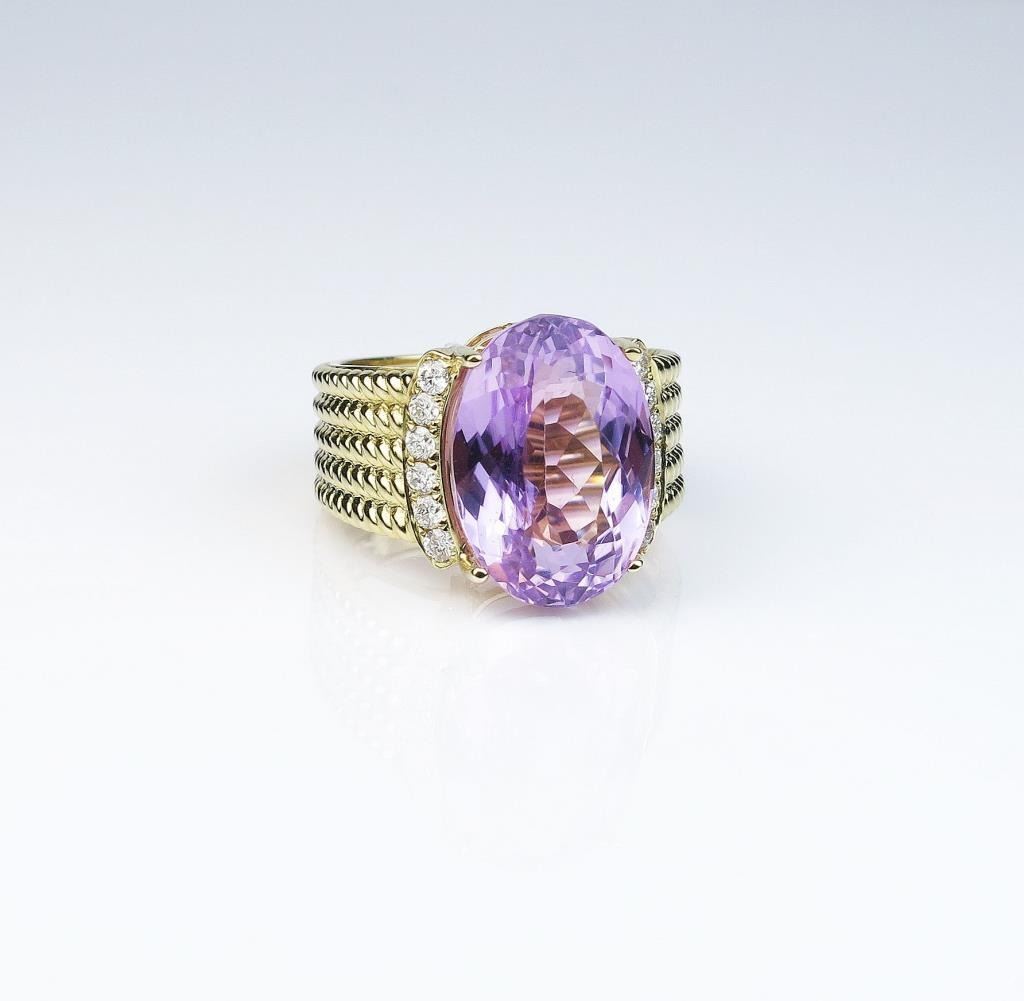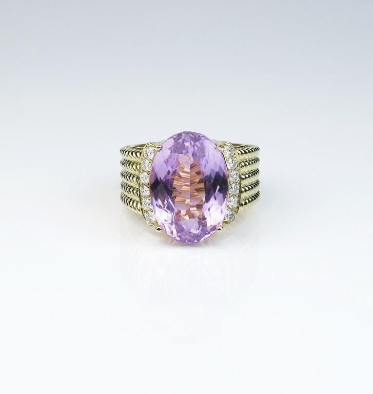 Very impressive ladies ring featuring an extra fine Lavender Pink Kunzite weighing approx. 15.00 carats with 12 round diamonds weighing approx. 0.40 carats of F-G colors and SI clarity set in a handmade wire designsetting. Retail $3,000-$4,000 Estimates $2,500-$3,500 Nice