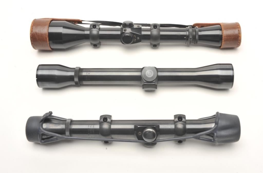 Lot of 3 scopes including a Cornell 4-9X40 scope with mounts for an ’03 Springfield bolt action A-4 rifle showing great optics; a Weaver K4 scope with mounts, also for an A-4 rifle with fine optics and a Weaver Marksman4X scope with sharp optics. Est.: $300-$600.