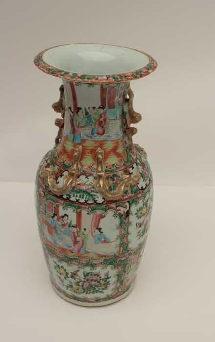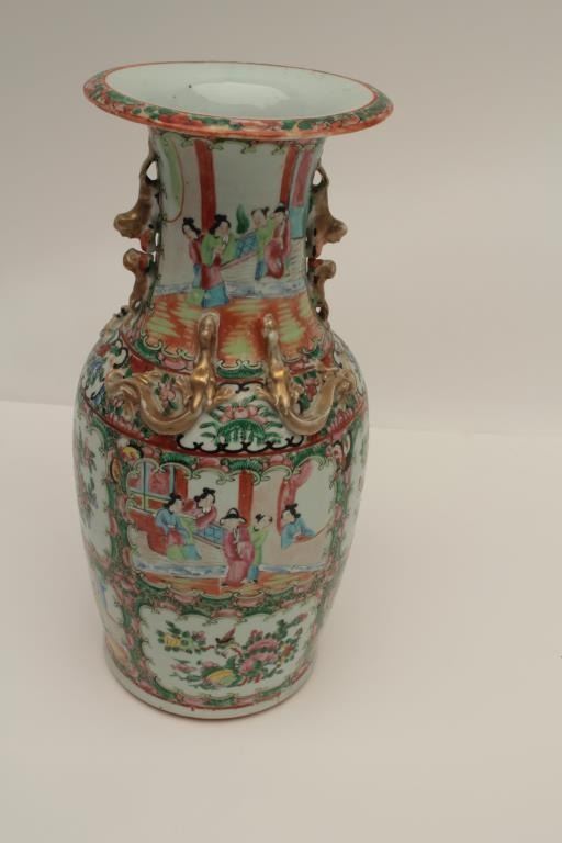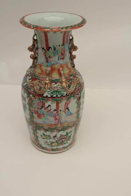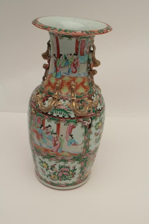 Chinese antique porcelain vase with overlaid ornamental handles and hand painted scenes of very good quality circa 1790-1890, unsigned. Measures 17 ½” in height by 7 ½” across the center of mouth. In very good condition withminor imperfections and small losses. Est.: $400-$800