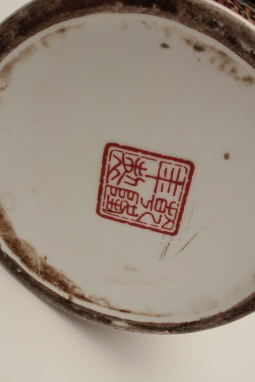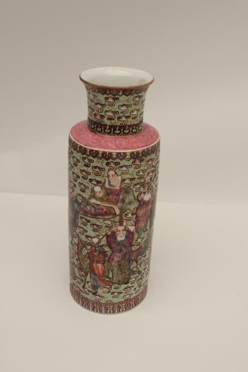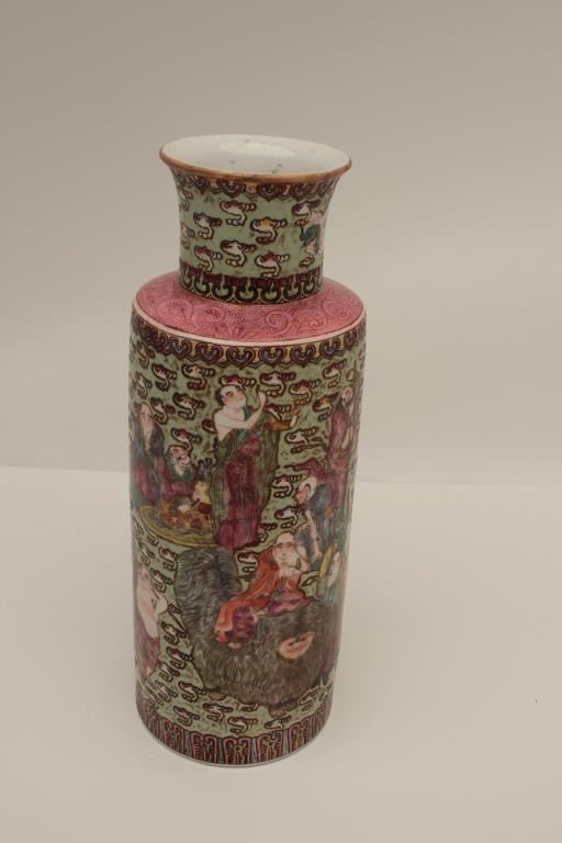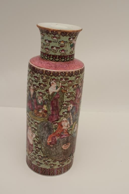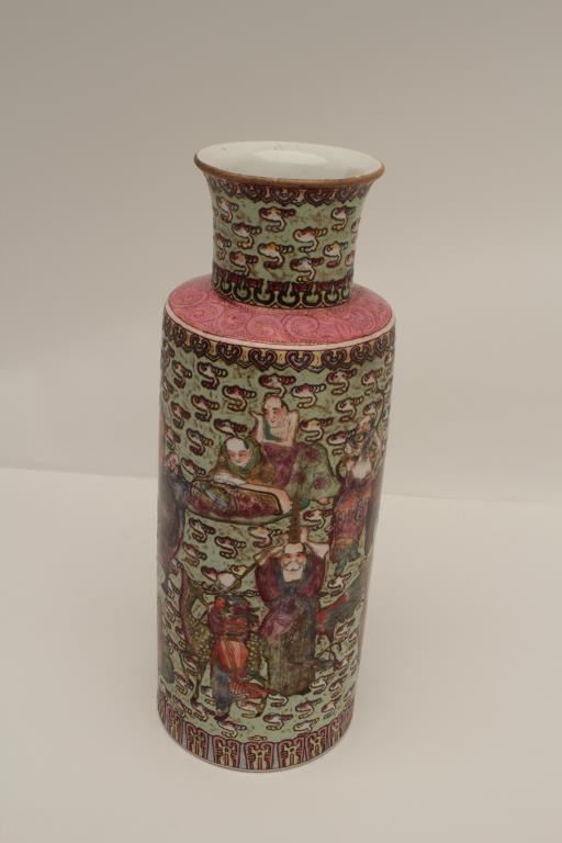 Royal Satsuma style Japanese porcelain vase. Immortals and mythological scenes including hairy man-orge. Measures nearly 18” in height and almost 7” across the center of the base. Signed in red. Approximately 100-200 yearsold. In very good plus condition with normal crazing to interior and minor imperfections. Est.: $600-$1200