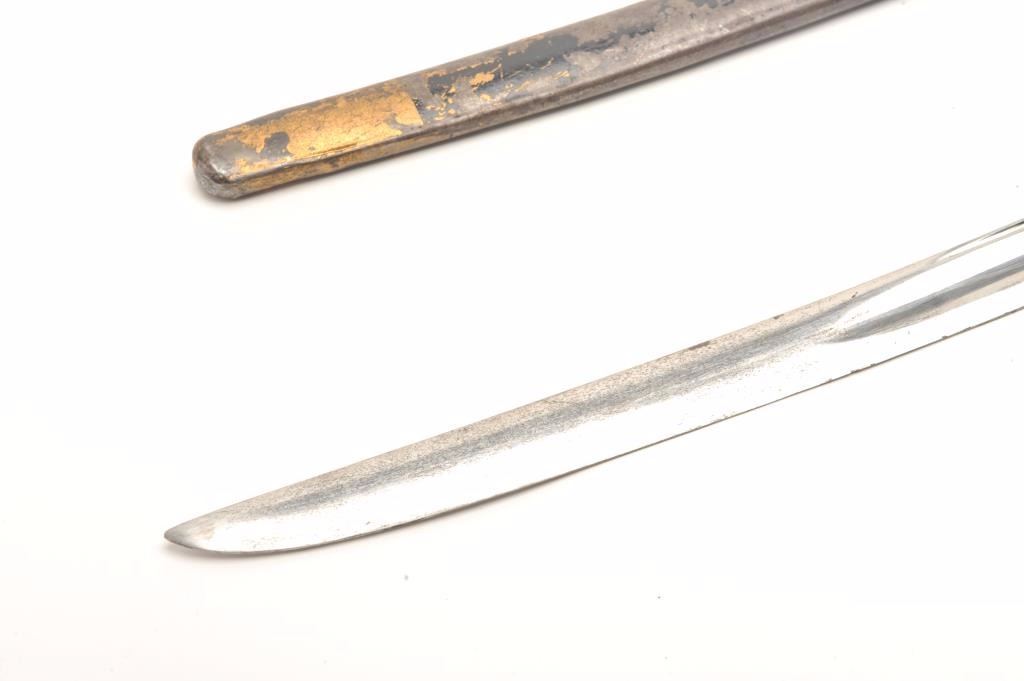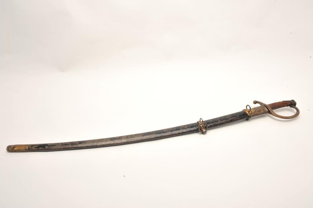 Mid-19th century artillery sword with scabbard probably Russian. Handle shows loss of covering and wrap. Otherwise good with scabbard. Est.: $250-$500