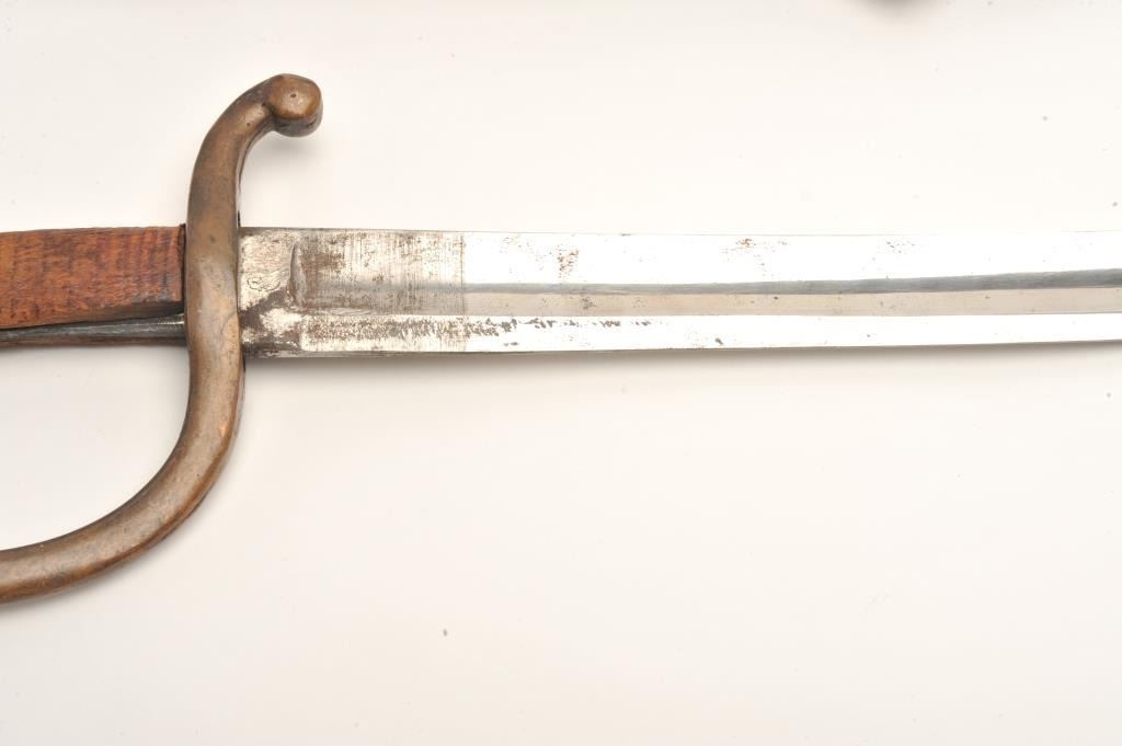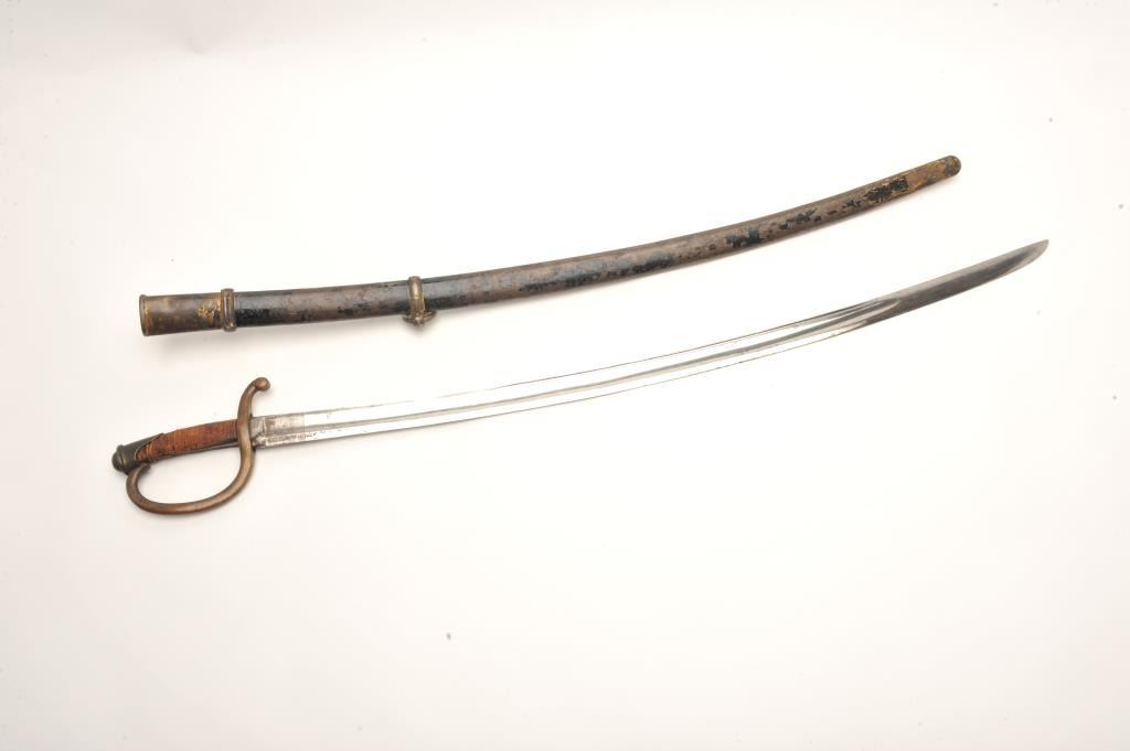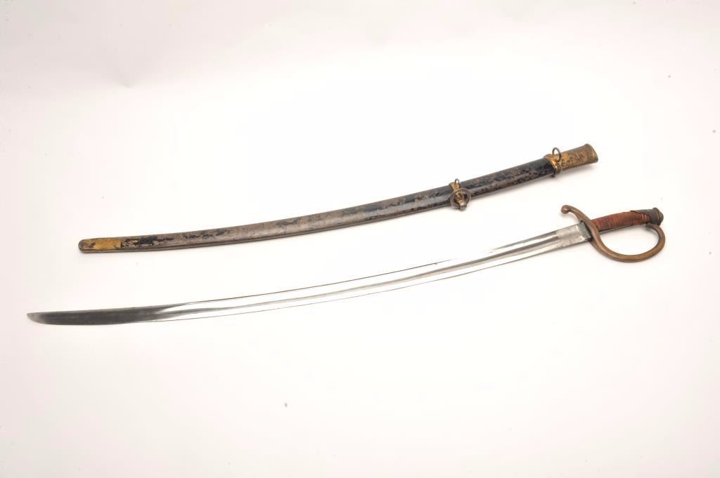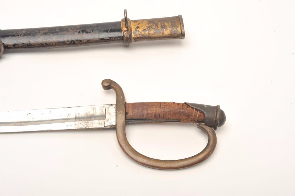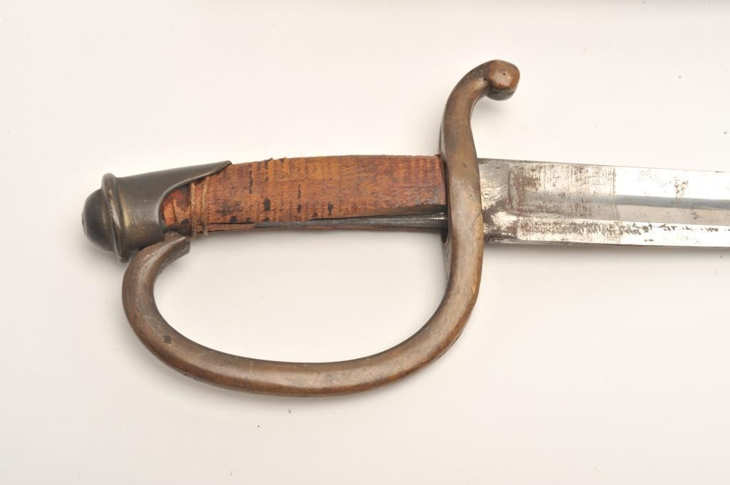 Lot 989 Mid-19th century artillery sword with scabbard probably Russian. Handle shows loss of covering and