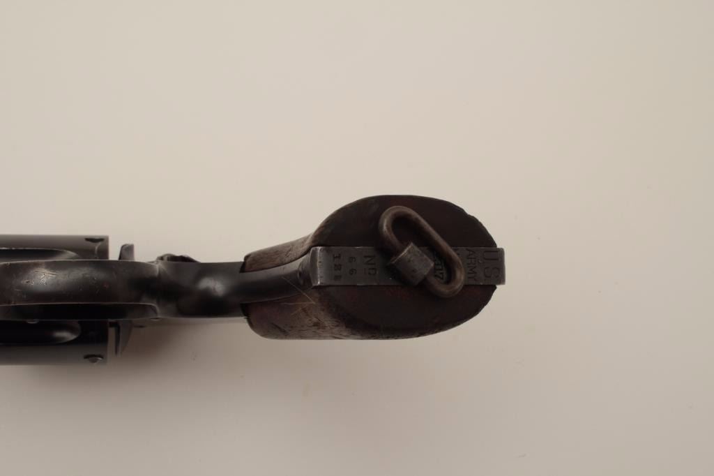 United States Property-marked, British proofed Smith & Wesson Model 1917 Army DA revolver, .45 caliber, 5.5” barrel, blued finish, wood grips, S/N 66128, in overall very good condition displaying the majorityof its blued finish, stamped on right side of frame “NOT ENGLISH MADE”, crisp action and markings, near fine bore, grips show wear and scattered old mars and scratches from handling and storage. (C&R). Est.:$300-$600.