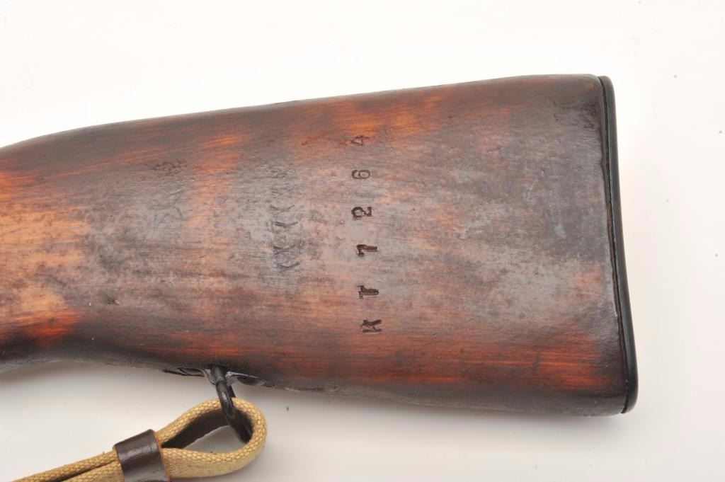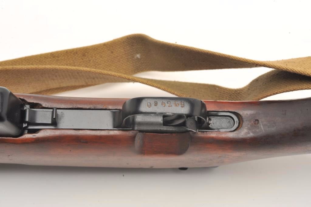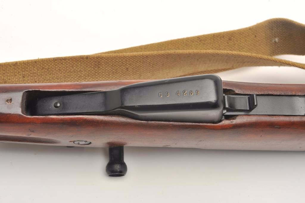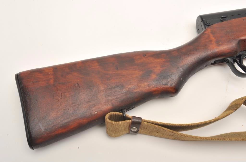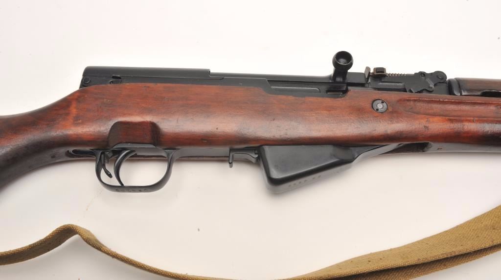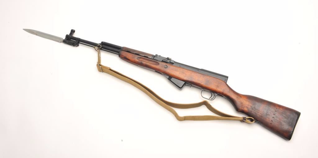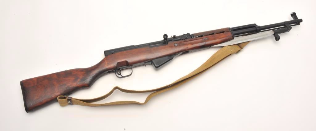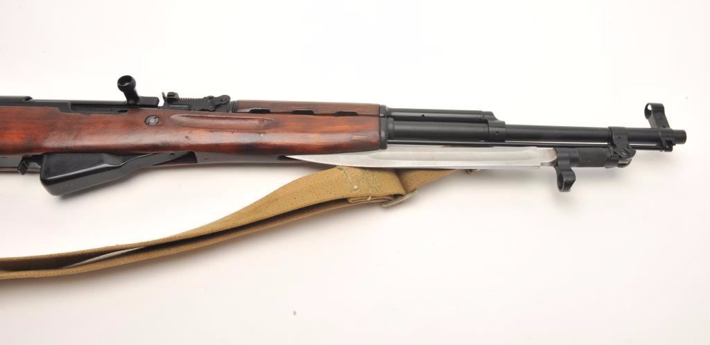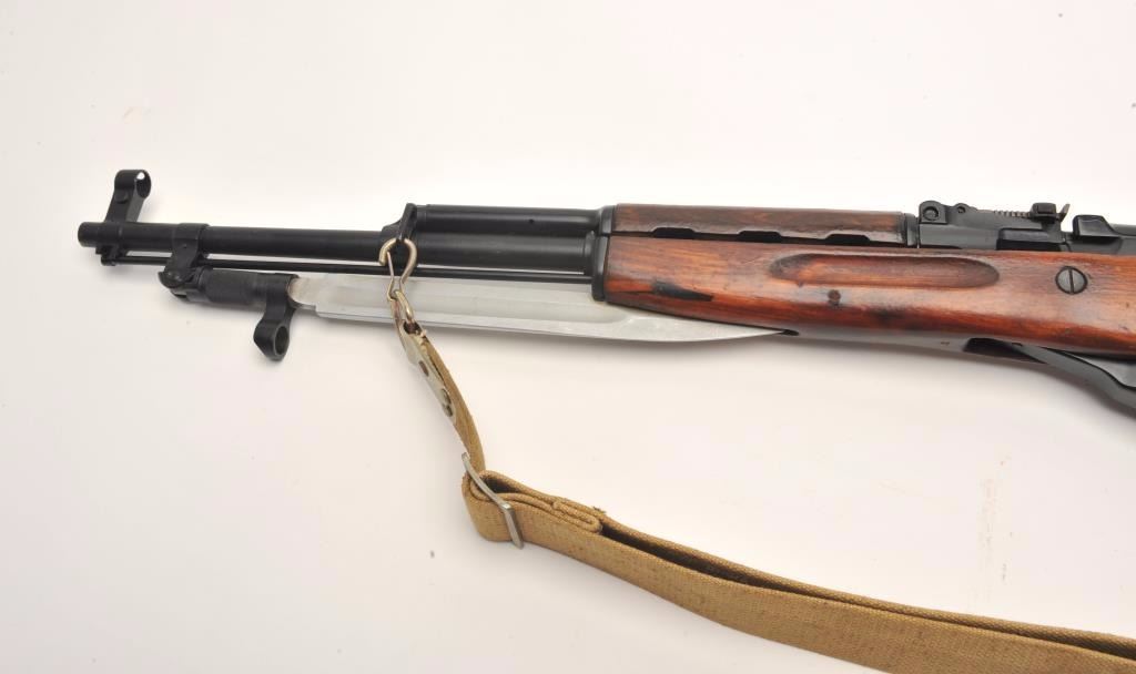 Russian SKS semi-auto rifle, 7.62 x 39 caliber, serial #034269. The rifle is in nearly excellent overall condition with a 20” import marked barrel. The rifle fitted with a hooded aircraft style front sight andmilitary tangent style rear. The barrel and receiver retain nearly all of their military finish with only light handling wear noted. All visible serial numbers are matching. The rifle also features a folding bayonet. Thesmooth wood stock is in very good condition with storage marks only. The butt stock ends with a smooth metal butt plate and features a non-matching serial number. The bore is very good, the action is crisp and markingsare sharp. The lot includes a military style canvas sling and sling swivels. (C+R) Est.: $350-$700.
