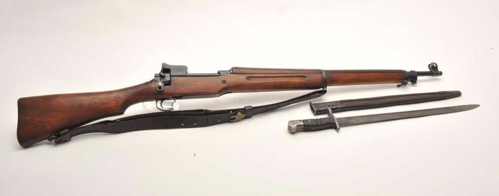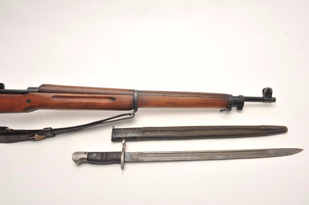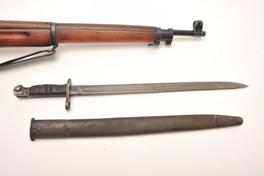 U.S. Model 1917 bolt action rifle by Winchester, .30-06 caliber, 26” Winchester barrel, dated 6-18, military finish, wood stock with leather sling and Winchester 1917-dated bayonet and correct sheath, S/N327235, in overall very good + condition displaying majority of military finish, very good bore, crisp action and markings, very good + wood stock. (C&R). Est.: $400-$800.