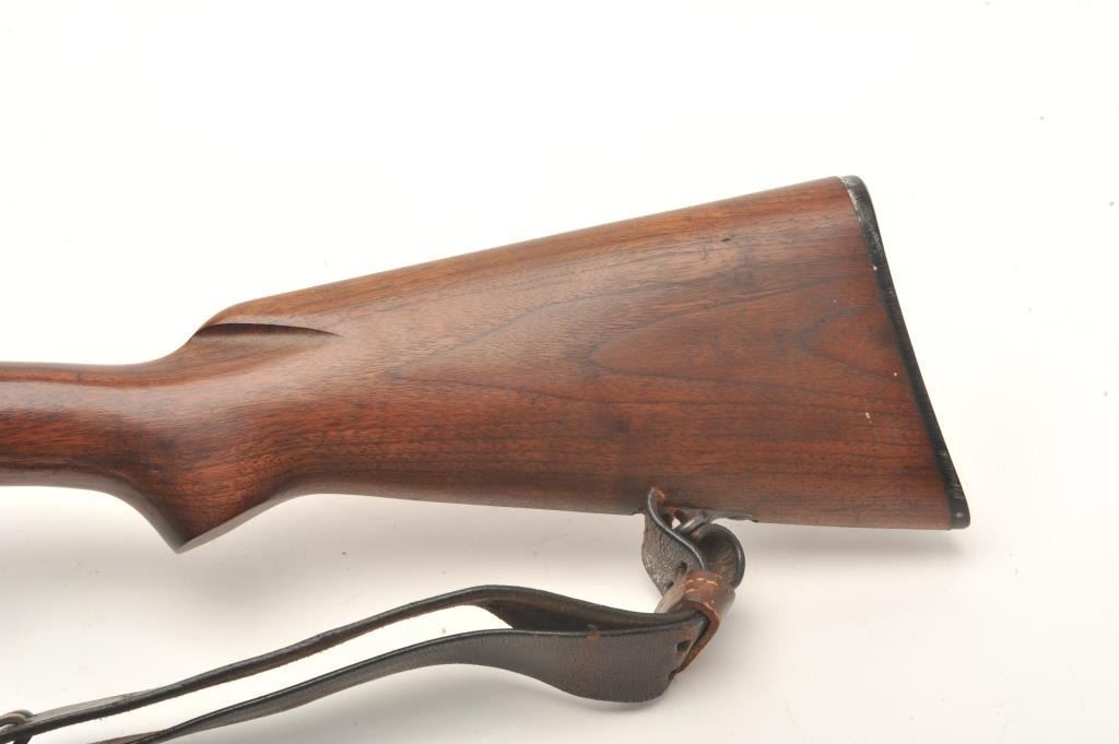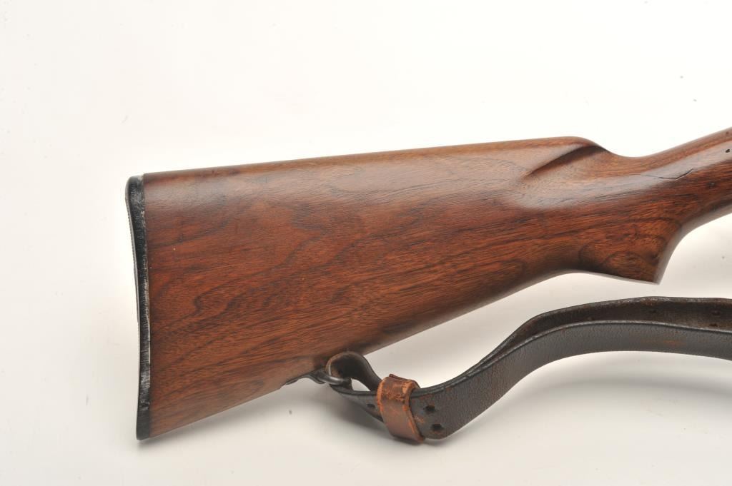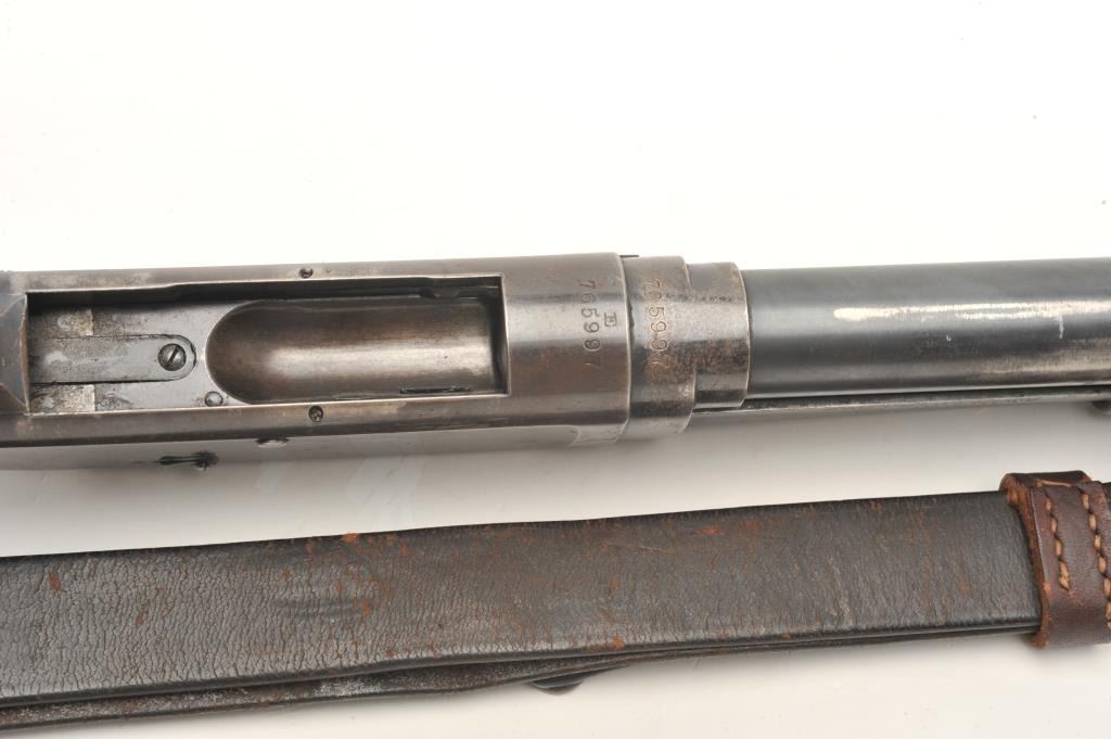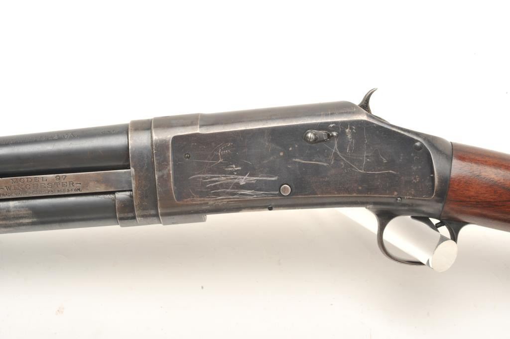 Winchester Model 97 pump action shotgun converted to trench gun (no flaming bomb or U.S. markings visible), 12 gauge, 21.5” takedown barrel, ventilated barrel hand guard, blued finish, wood stocks, checkeredWinchester hard rubber butt plate, leather sling, S/N E765997 (on frame and barrel assembly); in overall good to very good condition displaying considerable blued finish, some scratches primarily on left side of receiver, “WPD014” scratched onto trigger guard, very good + bore, crisp action, good markings and overall very good wood displaying no proofs or cartouches. (C&R). Est.: $350-$700.