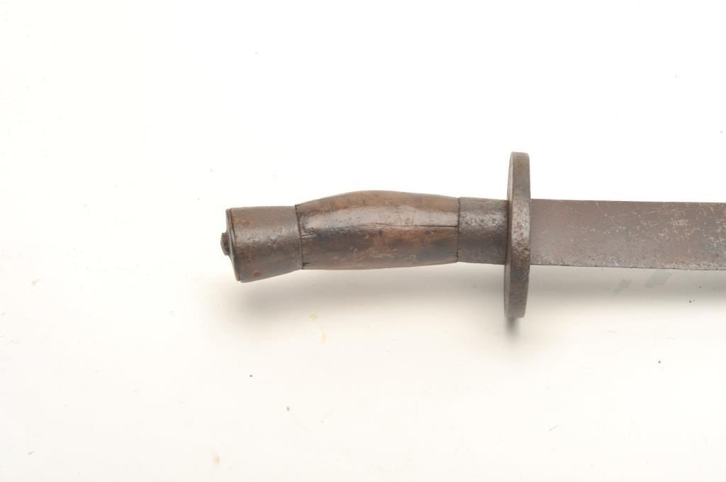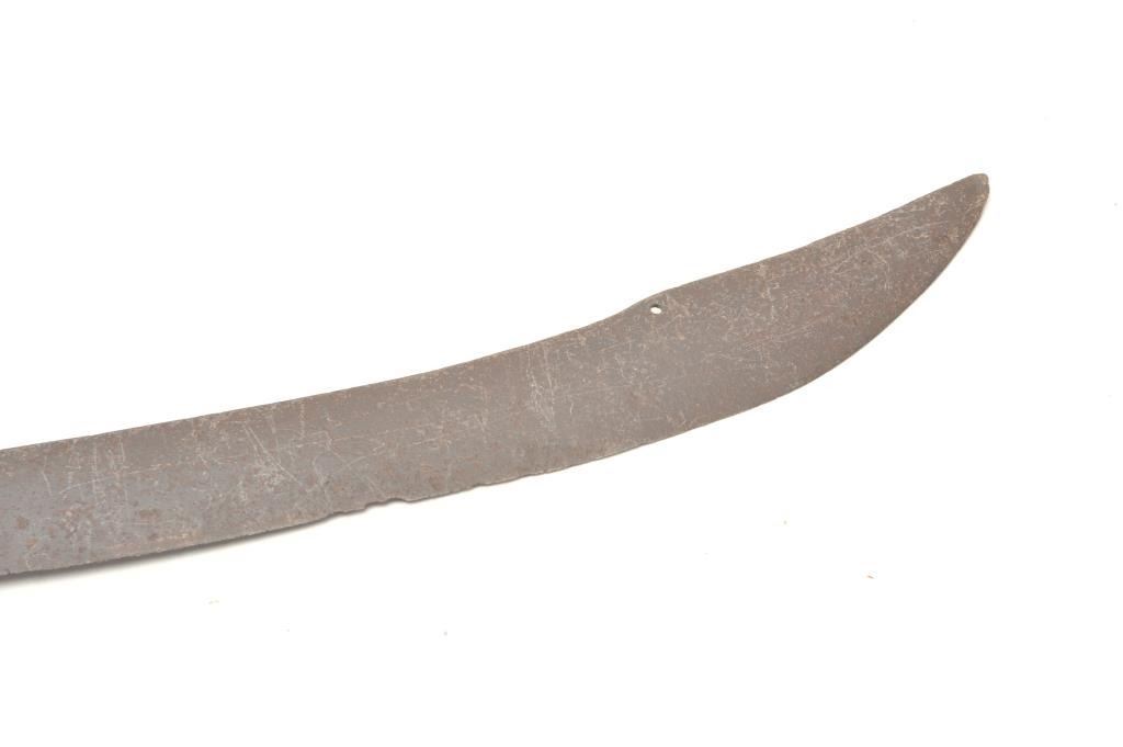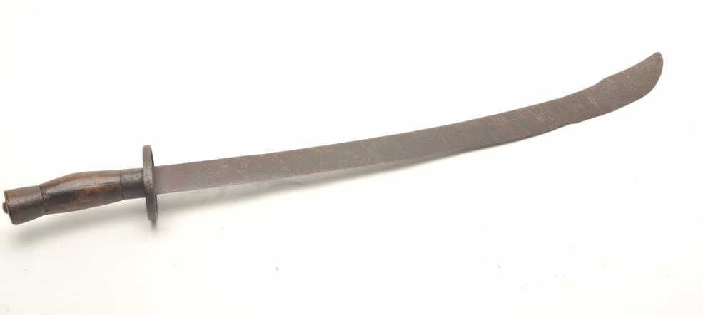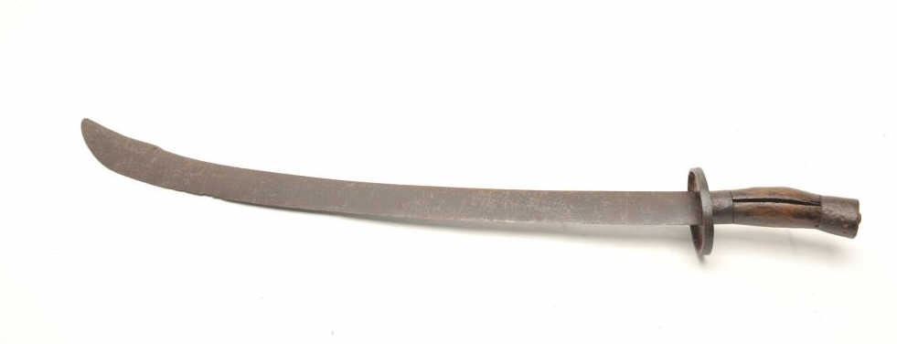Chinese sword approximately 125-200 plus years old. Measures 33 ½” overall with a 27 ½” blade and 2” across the thickest part of flared blade. Metal is in good uncleaned condition. The wood grip is split badly.Est.: $300-$600