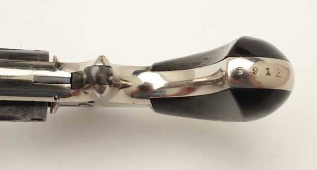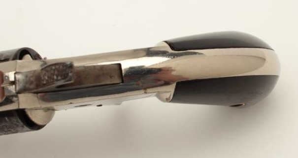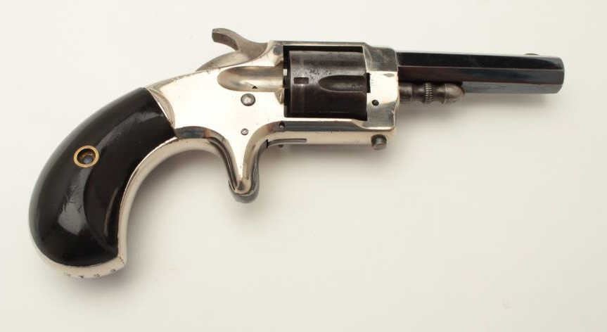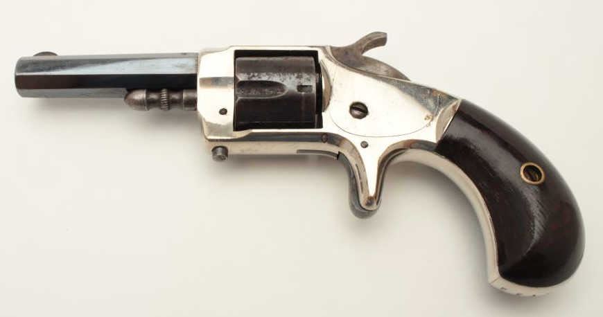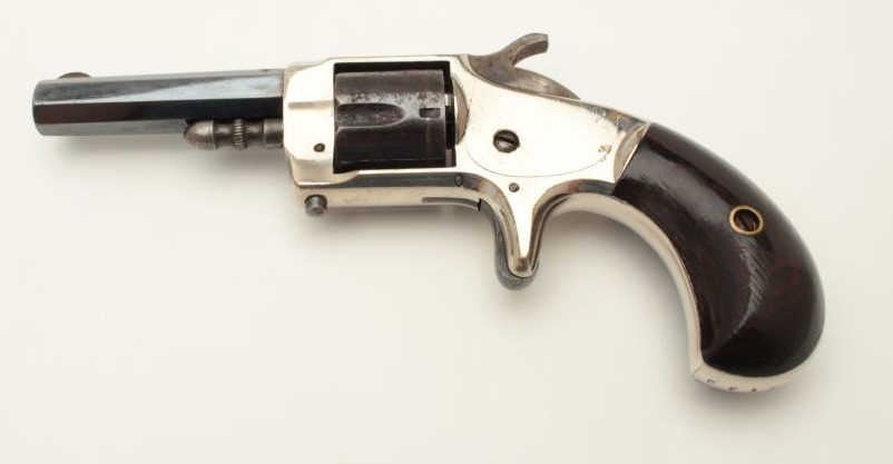 Whitneyville .22 caliber spur trigger revolver, 2.5” octagon barrel, blued and nickel two-tone finish, rosewood grips, S/N 591E; odd short barrel, unmarked address, somewhat unique. (Antique). From theWhitney family collection. Est.: $350-$700.