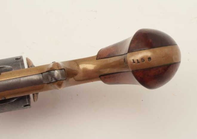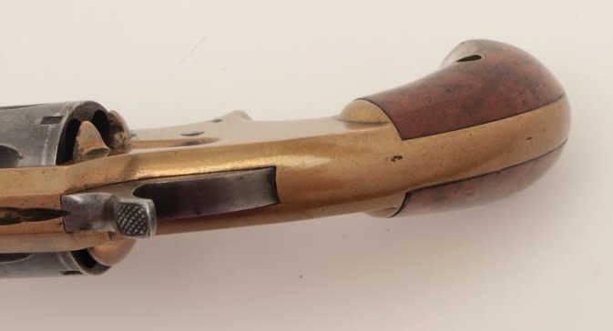 Whitney .32RF caliber spur trigger revolver, 6-shot, 5” octagon barrel, brass frame, blued cylinder and barrel, wood grips, S/N 1159, in overall very good condition; rare with less than a dozen viewed by 2nd GenerationWhitney family collector. (Antique). From the Whitney family collection. Est.: $500-$1,000.