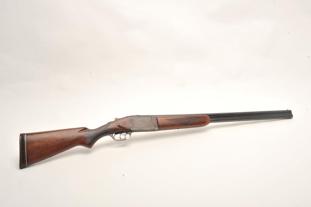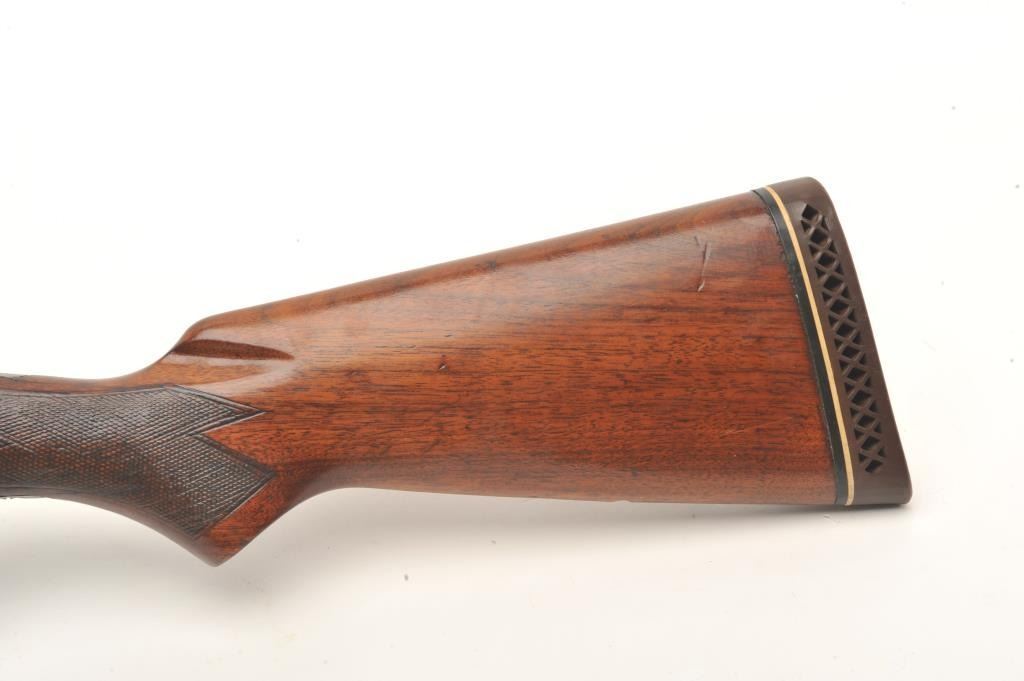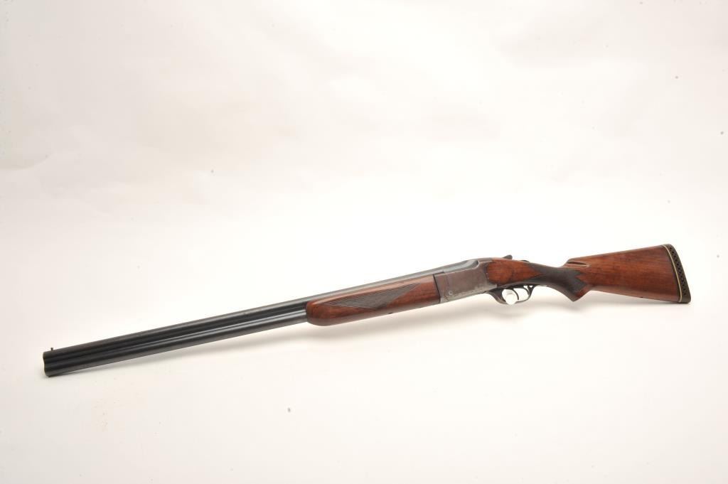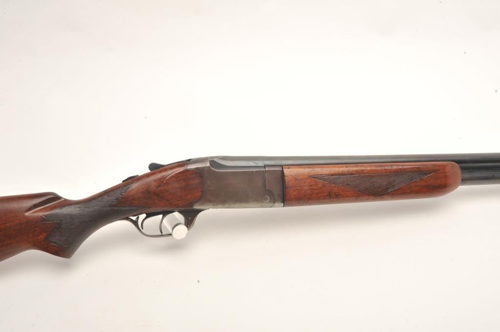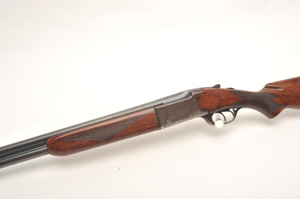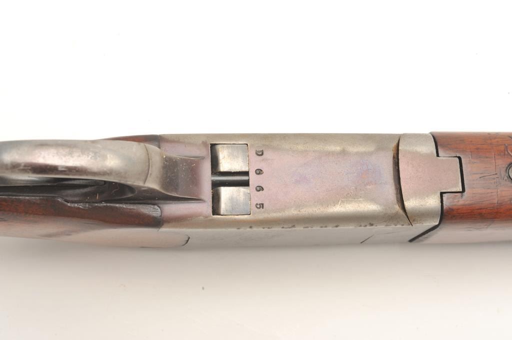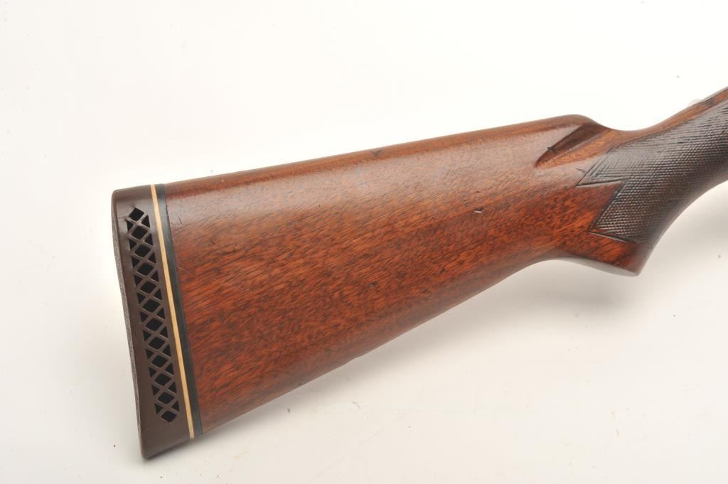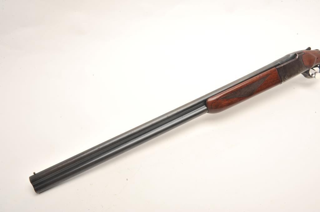 Marlin Model 90 O/U hammerless shotgun, 12 gauge, 30” barrels, blued finish, checkered wood stocks with added White Line hard rubber butt pad, S/N D665, in overall good condition with considerable muted bluedfinish on barrels and brown patina on receiver, bores should clean to good, crisp actions and markings, overall good wood. (Modern). Est.: $200-$400.