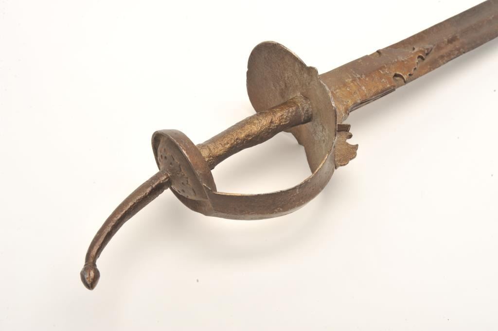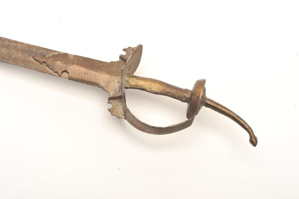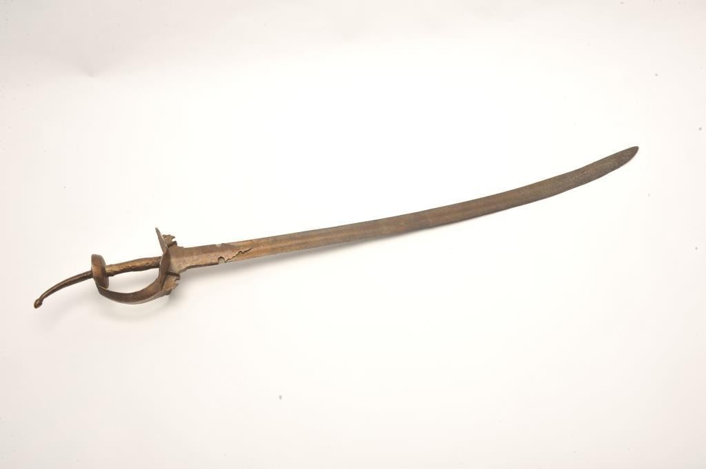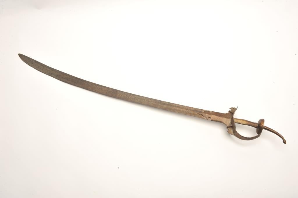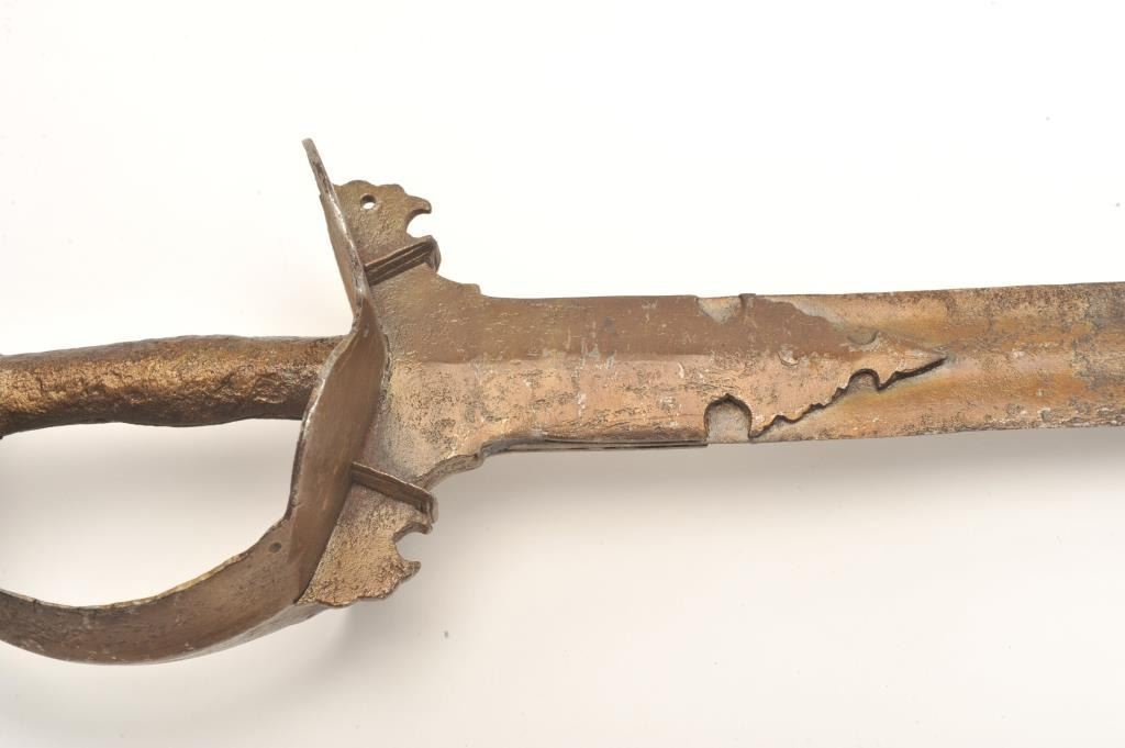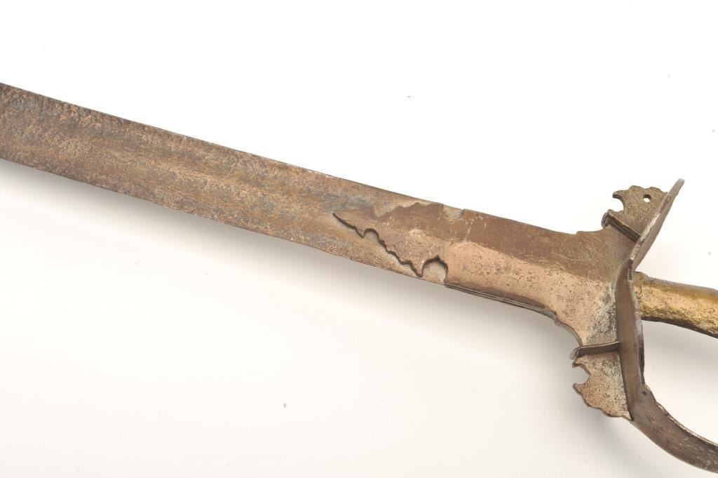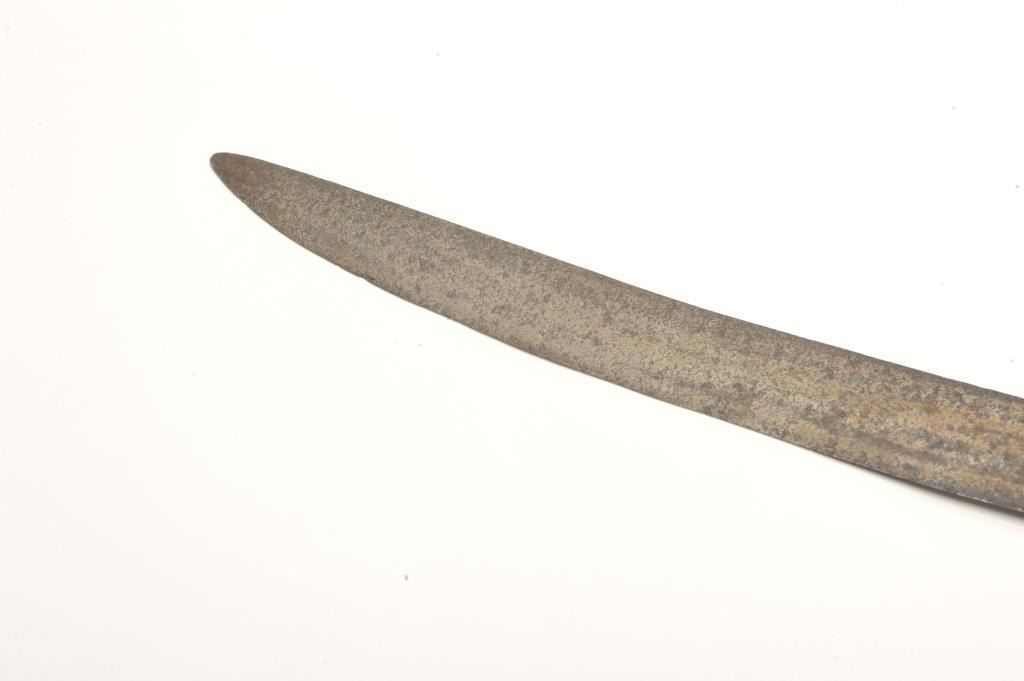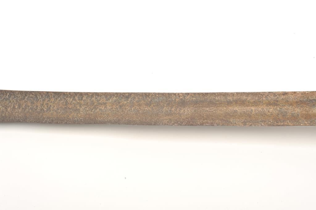 19th century or earlier sword from India. Measures 43 ½” overall with a 32 ½” blade. Nearly 1 ½” at the widest parts. Light to heavy pitting overall. Est.: $250-$500