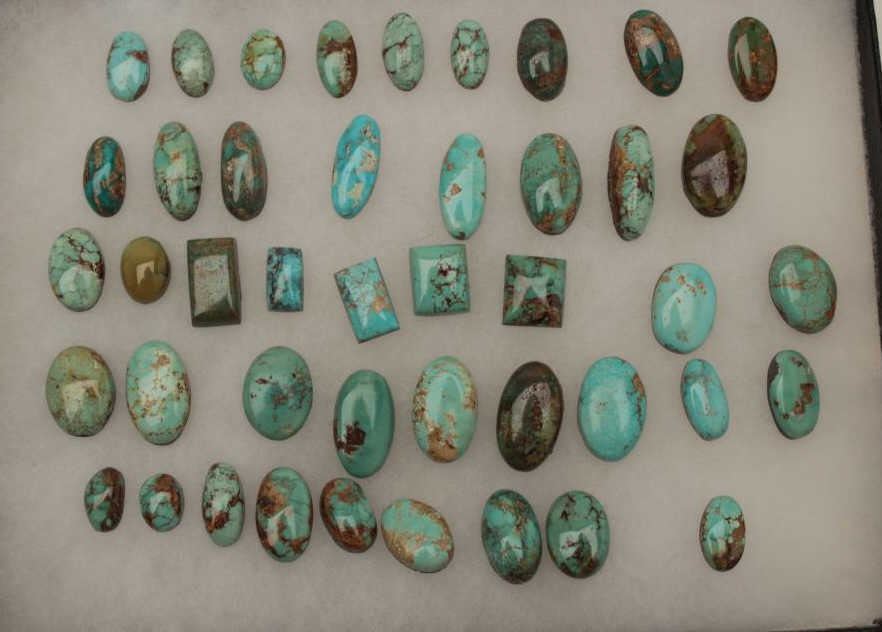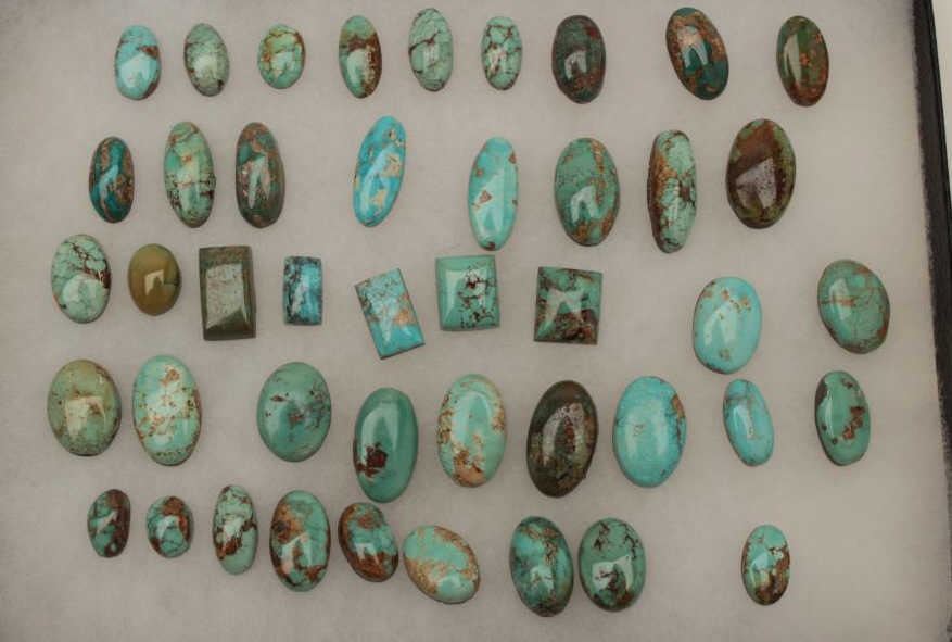 Riker case of approximately 44 old turquoise cut stones for jewelry; variety of shapes, sizes and colors. Est.: $150-$250.