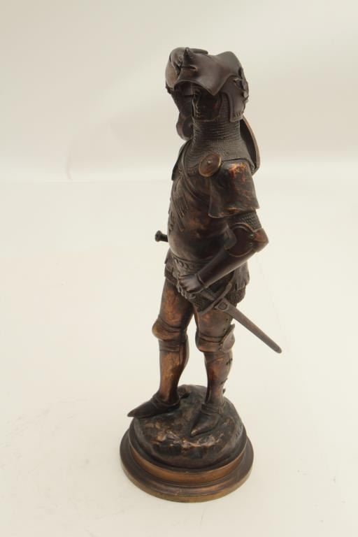 Authentic antique bronze circa turn of the century signed “J.E. Masson” and shows medieval knight in battle armor complete with “pig snout helmet”, rondell dagger, cruciform hilted great sword along withdetailed armor of 15th-16th century style. Measures 16” in height. Well detailed and researched from a top Westlake collector. Est.: $600-$1200