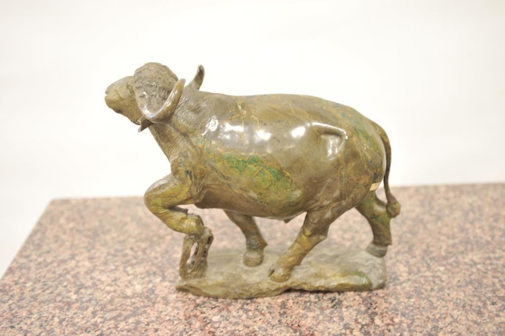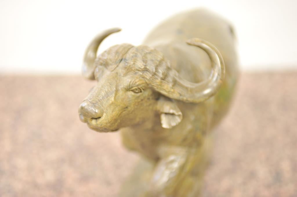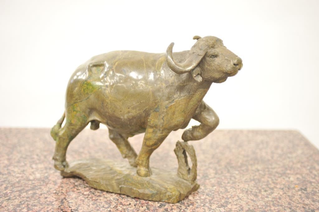 Carved hard stone (Verdite from Zimbabwe similar to jade) statue by P.M. Zubute considered the top African artist in this filed by many Safari Club and art collectors. This carving shows a cape buffalo andmeasures approximately 12” in height by 16” in length. Retails $3500. Est.: $800-$1600
