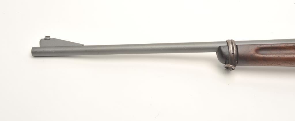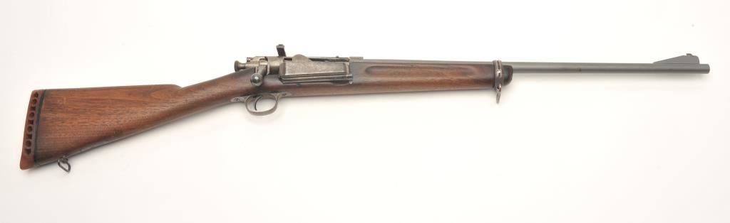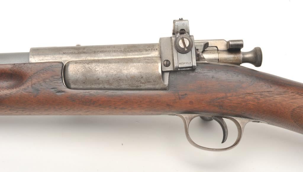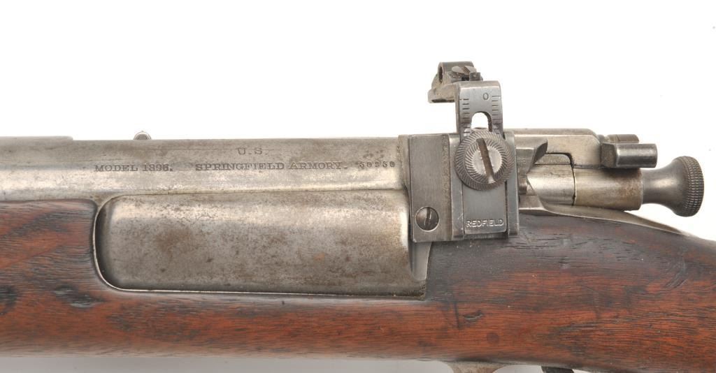 U. S. Springfield 1896 Krag bolt action rifle, .30-40 Krag caliber, serial #50950. The rifle is in fair overall condition with a 22 ½” barrel. The barrel has been re-finished in grey paint. The receiver hasgone to a silver/grey patina with light surface rust and a period Redfield aperture sight has been added in a side mount. The smooth wood stock is in fair condition showing heavy use with an old rubber recoilpad added. The bore is fair, the action functions and the markings are legible. (Antique) Est.: $300-$600.