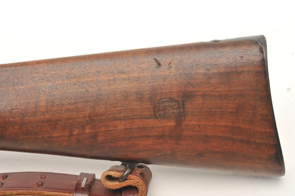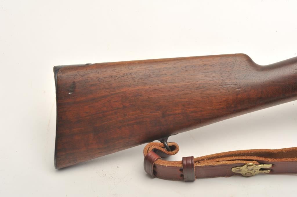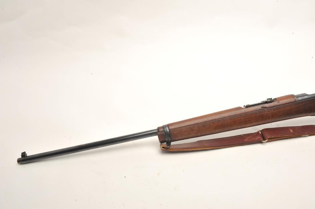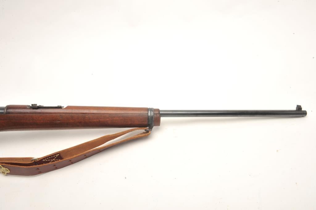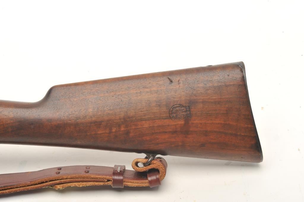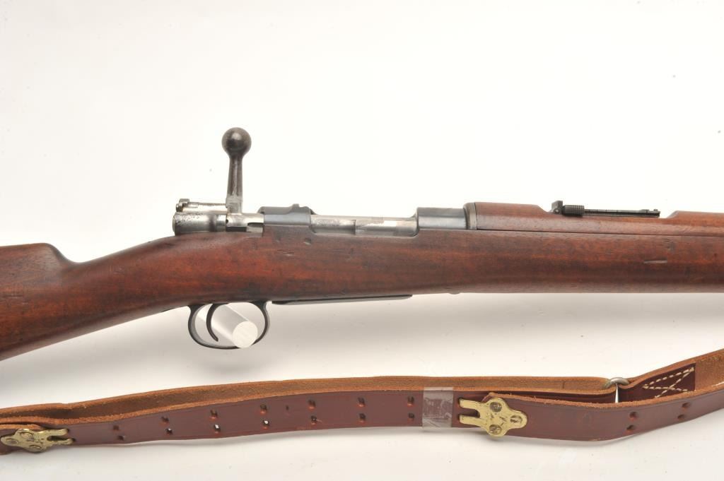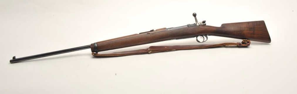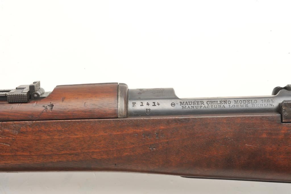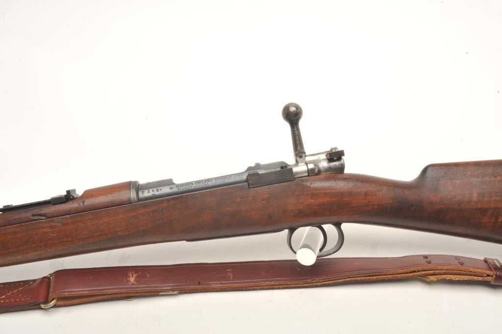 Sporterized Model 1895 Chilean Mauser bolt action rifle, 7mm caliber, 29.5” barrel, blued finish, wood stock with shortened forend, S/N F1414 (bolt #E5273); in overall good condition with a good bore, crispaction, good markings and good wood; modern leather sling included. (C&R). Est.: $150-$300.