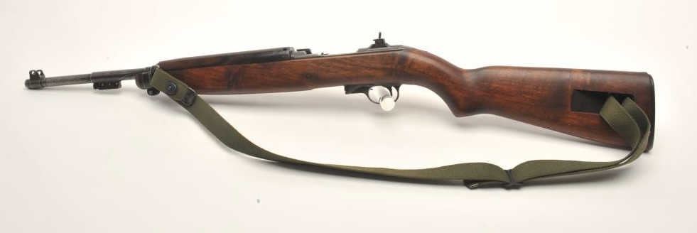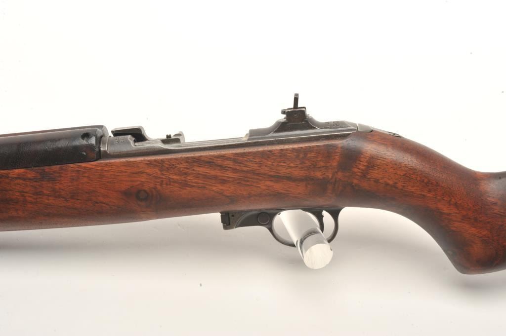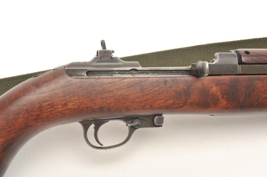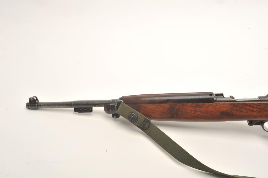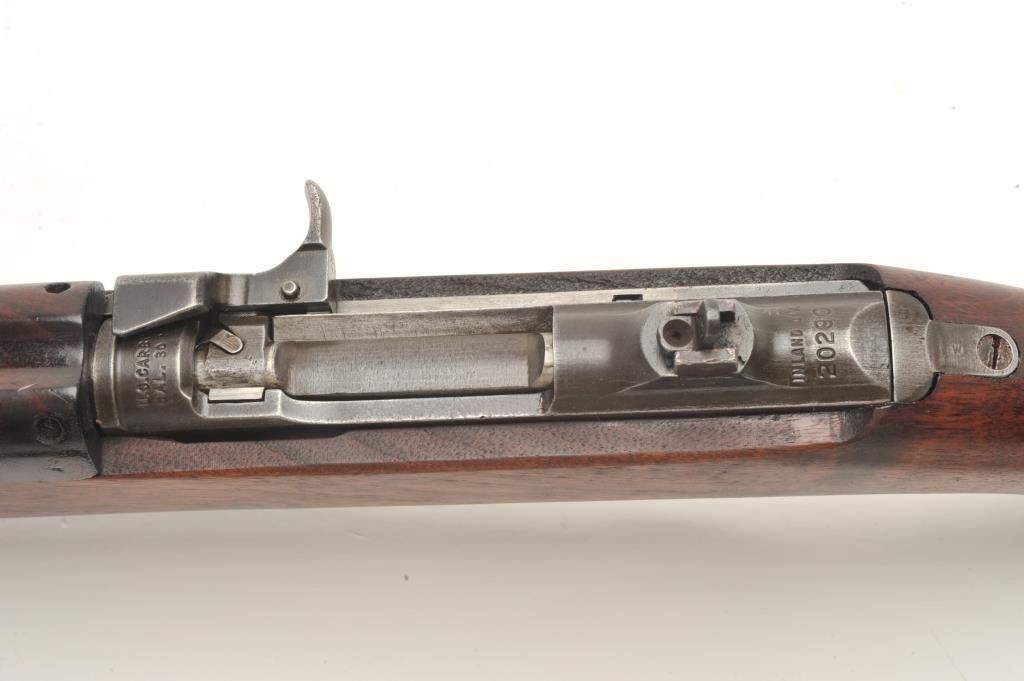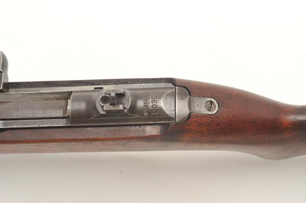 U.S. M1 semi-automatic carbine by Inland, .30 caliber, 18” Inland/General Motors barrel dated 7-42, military finish, bayonet lug, flat bolt and two-position flip-up rear sight, early S/N 20290, no magazine, wovengreen sling with metal oiler; in overall good to very good condition with very good bore, good action and markings; very good + wood. (C&R). Est.: $400-$800.
