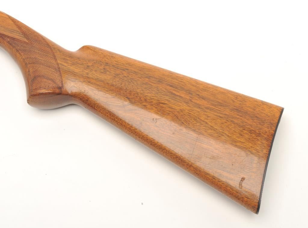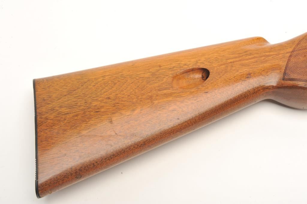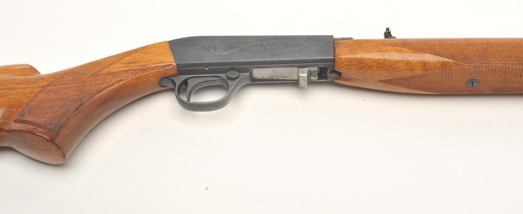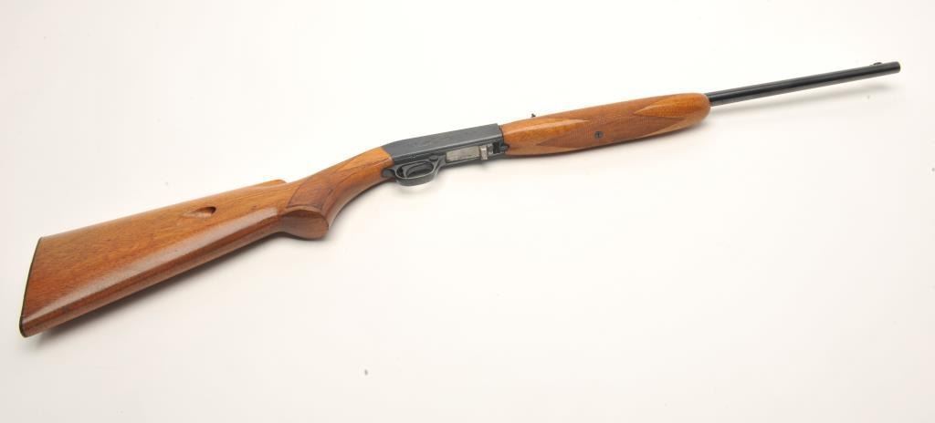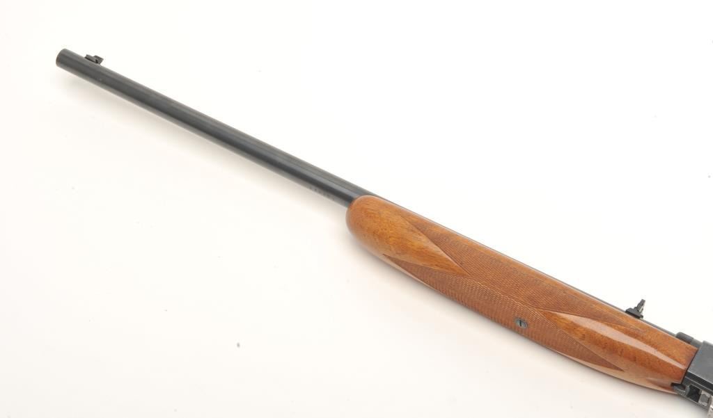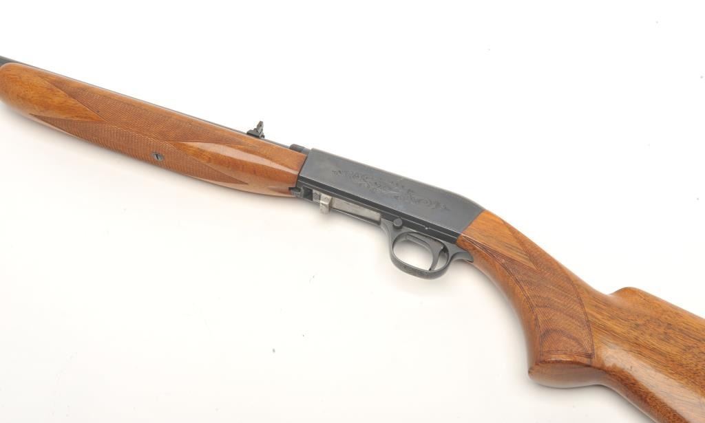 Belgian Browning Grade 1 semi-auto rifle, .22 Long Rifle caliber, serial #4T9374. The rifle is in very good overall condition with a 19” barrel. The barrel and receiver retain nearly all of their polished blue finish.The checkered wood stocks are in very good condition with small mars and compressions consistent with field use. The bore is very good, the action crisp and markings are sharp on this lightly used Browning.(Modern) Est.: $400-$800.