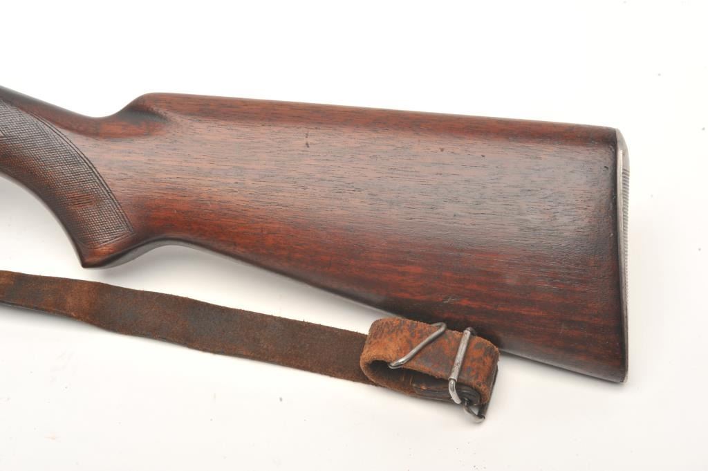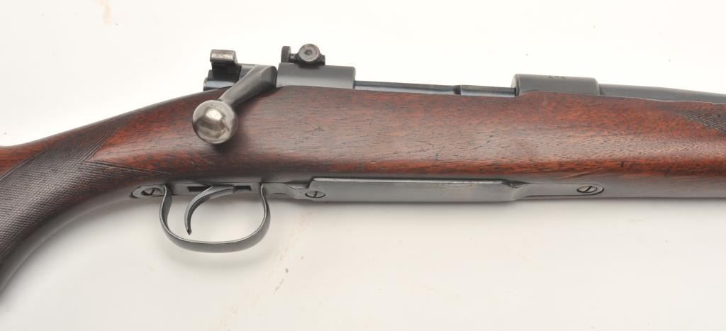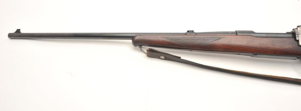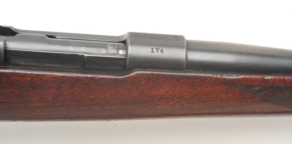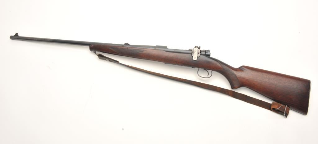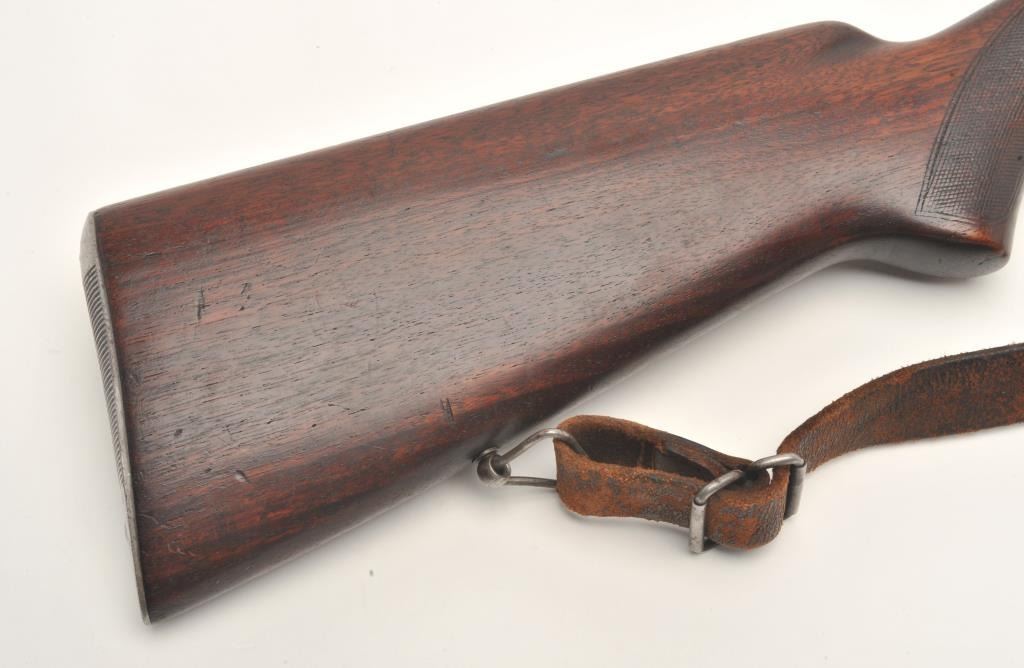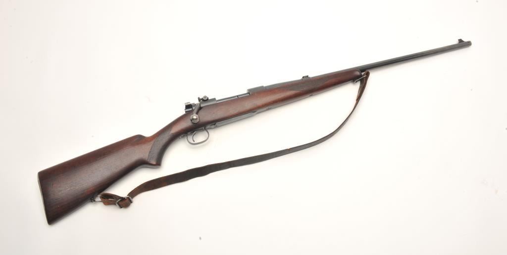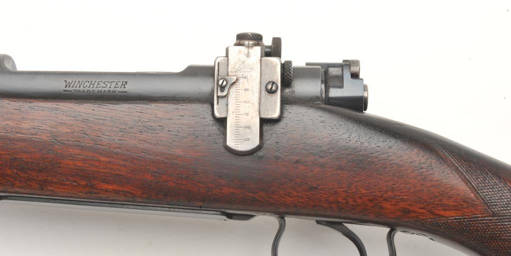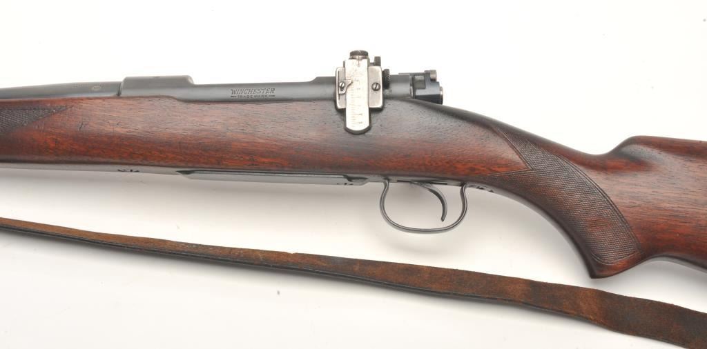 Winchester Model 54 bolt action rifle, .30 caliber, serial #174. The rifle is in good to nearly very good overall condition with a 24” barrel with a ramp front and two-leaf folding rear sights. The barrel and receiver retain the majority of their blued finish with wear at the muzzle and in front of the action. The receiver has been drilled and tapped for a scope mount and a period Lyman peep sight in a side mount has been added.The checkered wood stock is in good condition with mars, compressions and some flattening of the checkering. The butt ends with a steel butt plate and a leather sling has been added. The bore is good, the action crispand markings are sharp on this desirable Winchester with a three digit serial number circa 1925. (C+R) Est.: $600-$1,200.