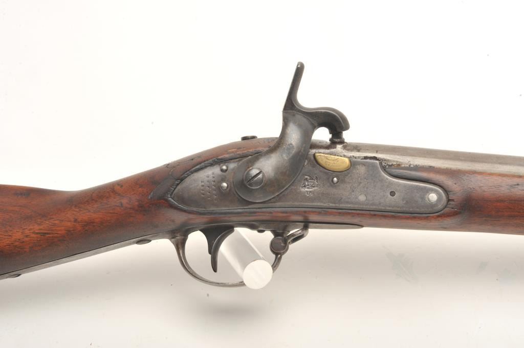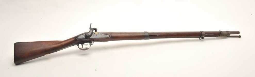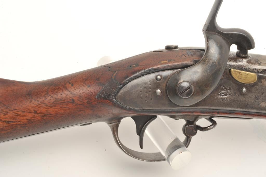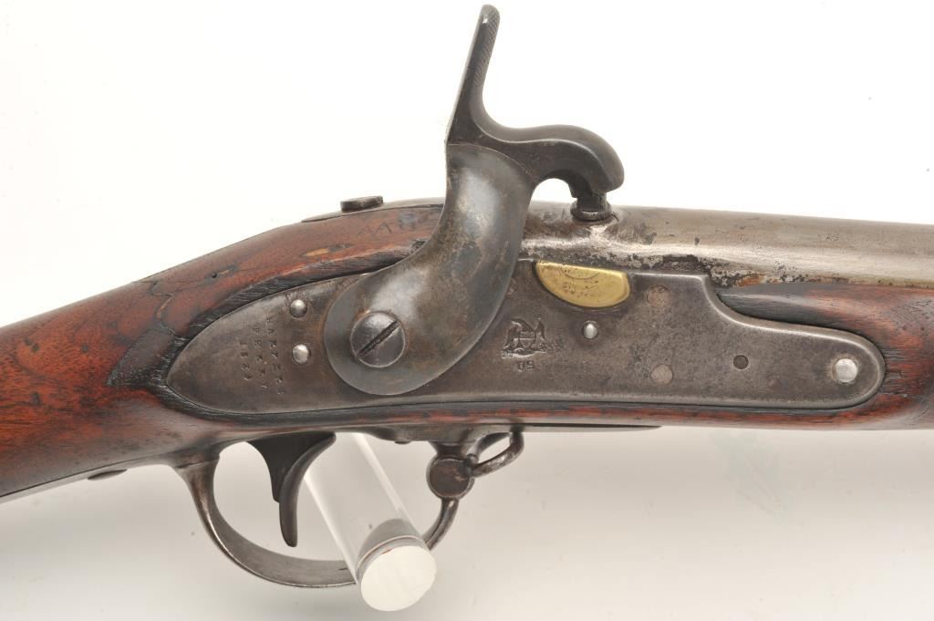 Harper’s Ferry percussion conversion rifle, .69 caliber, 35.5” barrel, wood stock with old repairs around the top of the wrist area, in overall fair to good condition displaying a grey patina to metal surfaces, good action and markings, fair to good wood showing an old repair to a break at the wrist area; old partial loss of rear barrel band retainer; conversion style of percussion nipple threaded into the top of the barrel at breech sometimes referred to as a “Southern conversion”; lockplate dated 1839. (Antique). Est.: $400-$800.