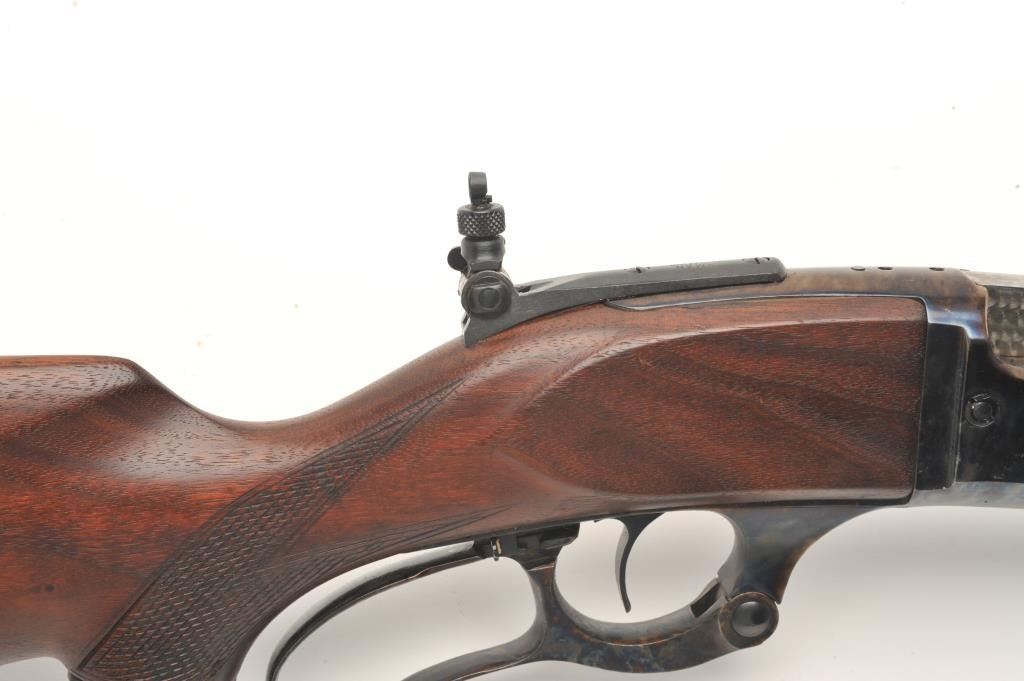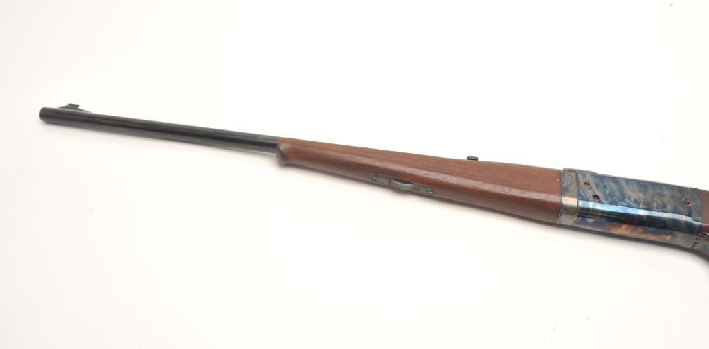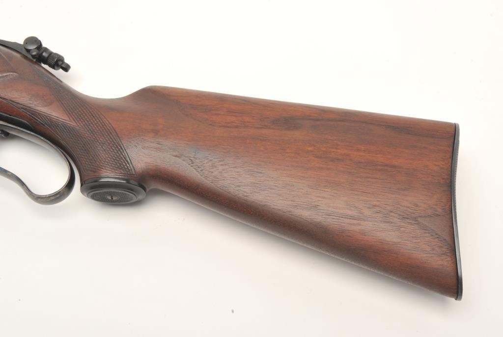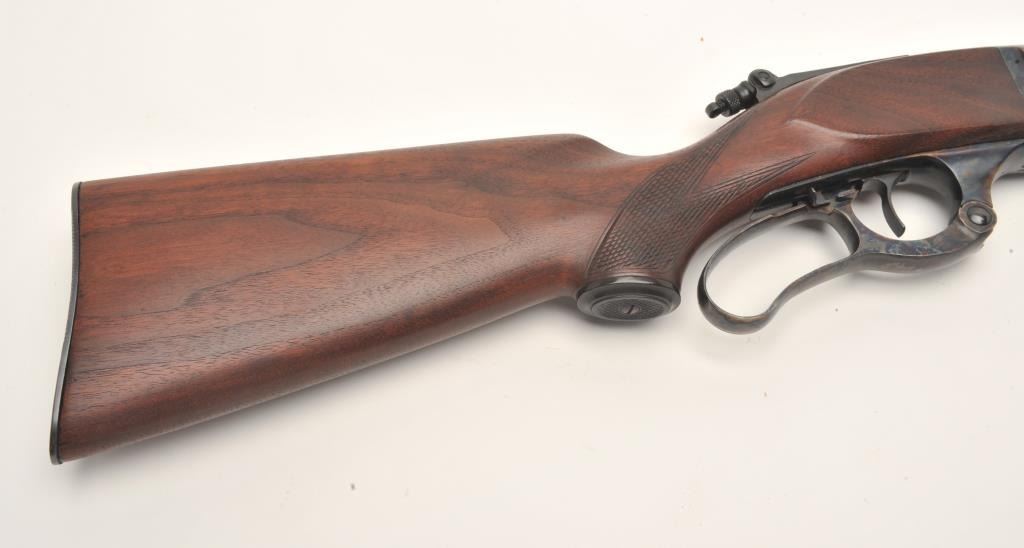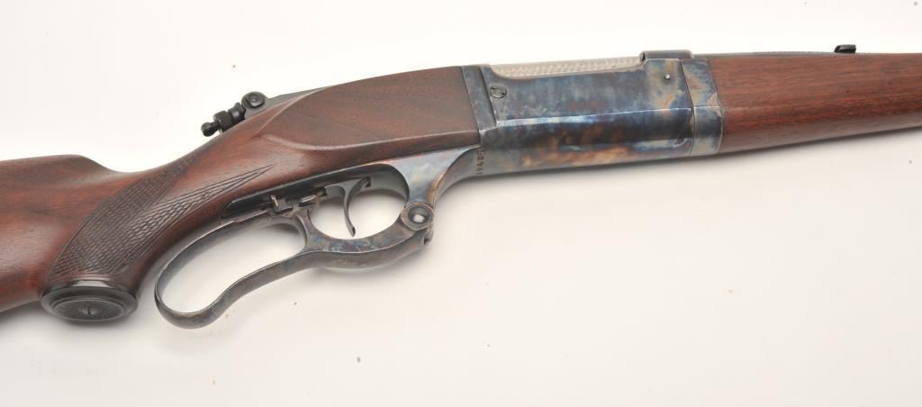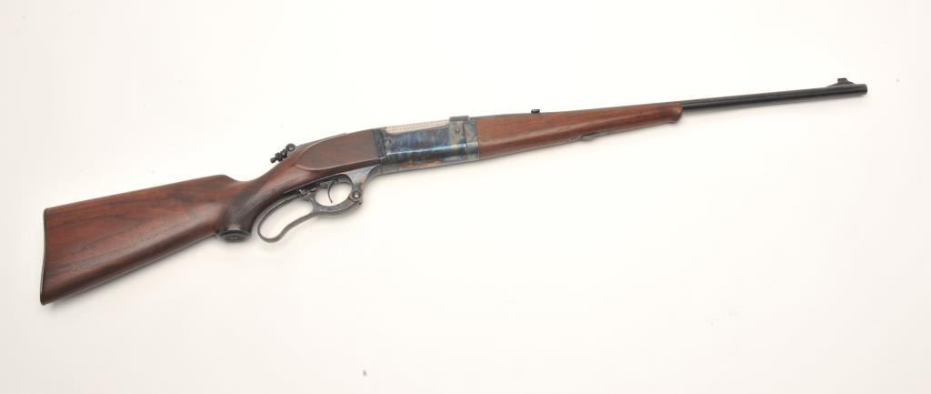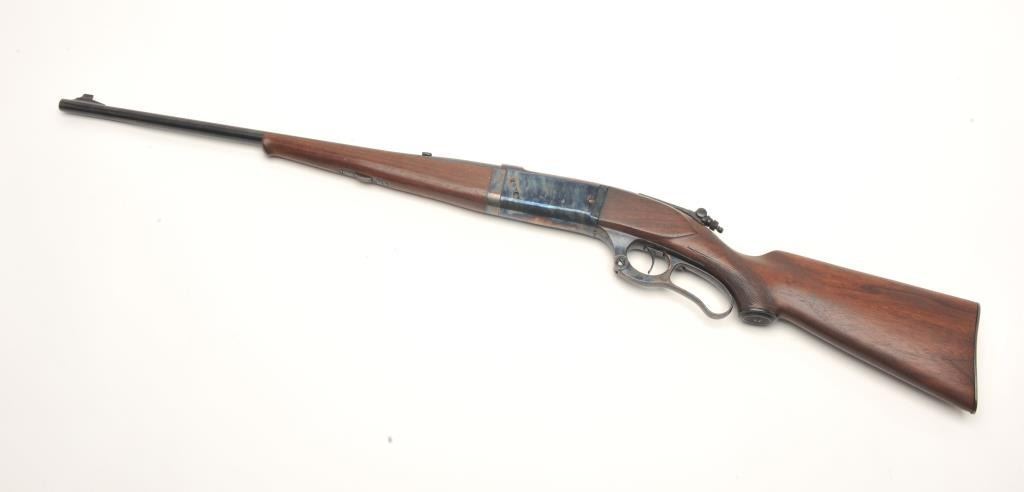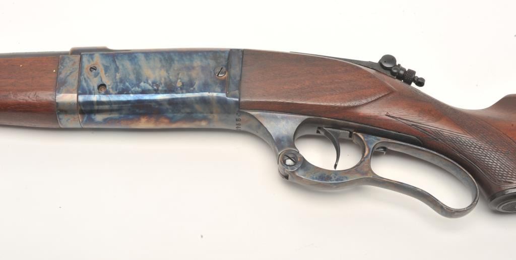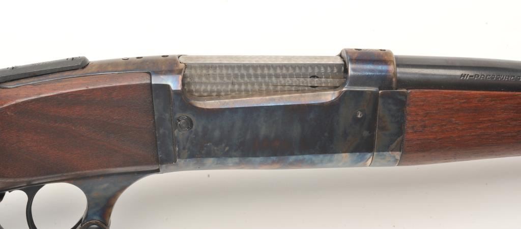 Savage Model 99 lever action takedown rifle, .250-3000 Savage caliber, serial #327551. The rifle is in very good overall condition as re-finished. The rifle features a 22” round barrel with a blade front and rearsight removed. The barrel retains a significant amount of an old, quality re-blue while the receiver and lever have been case colored and the bolt jeweled. A Lyman tang sight has been added during the period ofuse. The checkered wood stock is in very good condition showing small mars and compressions consistent with storage. The butt stock ends with a Savage marked steel butt plate. The bore is good, the actioncrisp and markings are sharp on this desirable Savage 99 in a great chambering. (C+R) Est.: $400-$800.