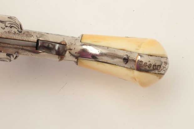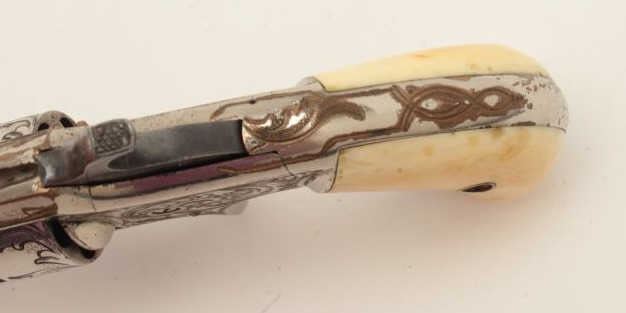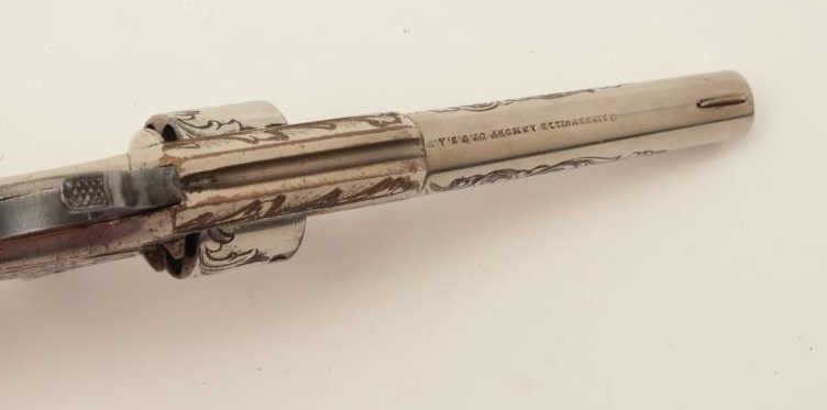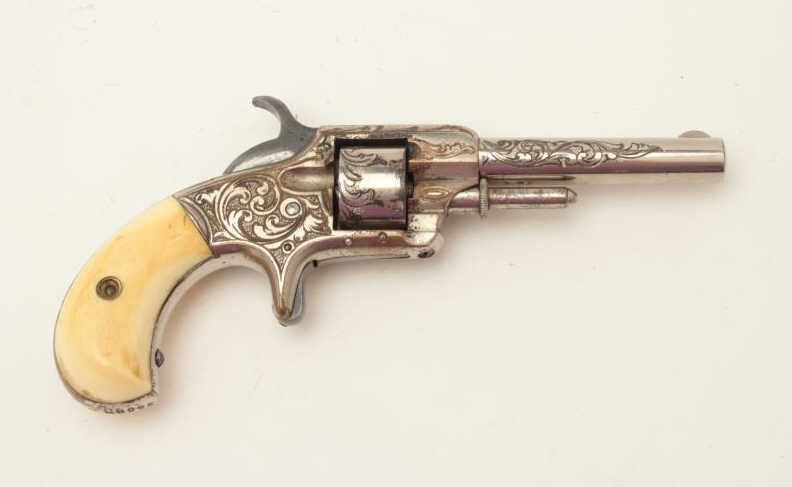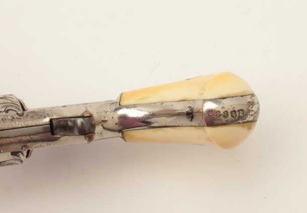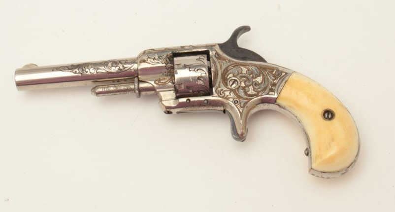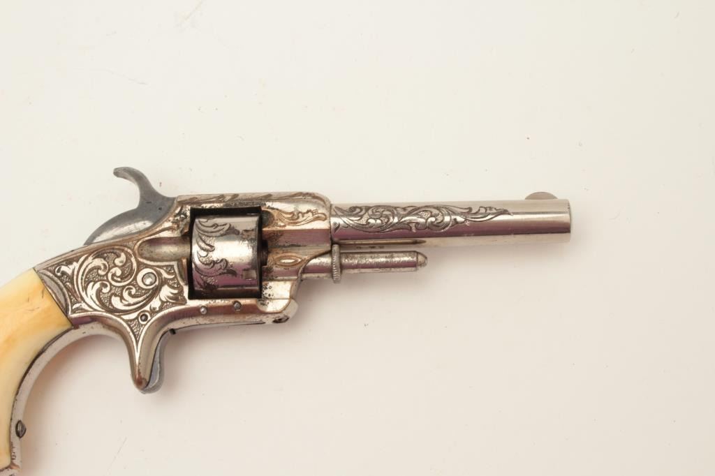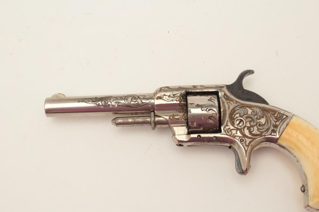 Rare Whitneyville .22 caliber spur trigger revolver, 3” round barrel, non-fluted short cylinder, engraved, nickel finish, ivory grips, S/N 2239B, in overall very good to near fine condition. (Antique). Fromthe Whitney family collection. Est.: $400-$800.