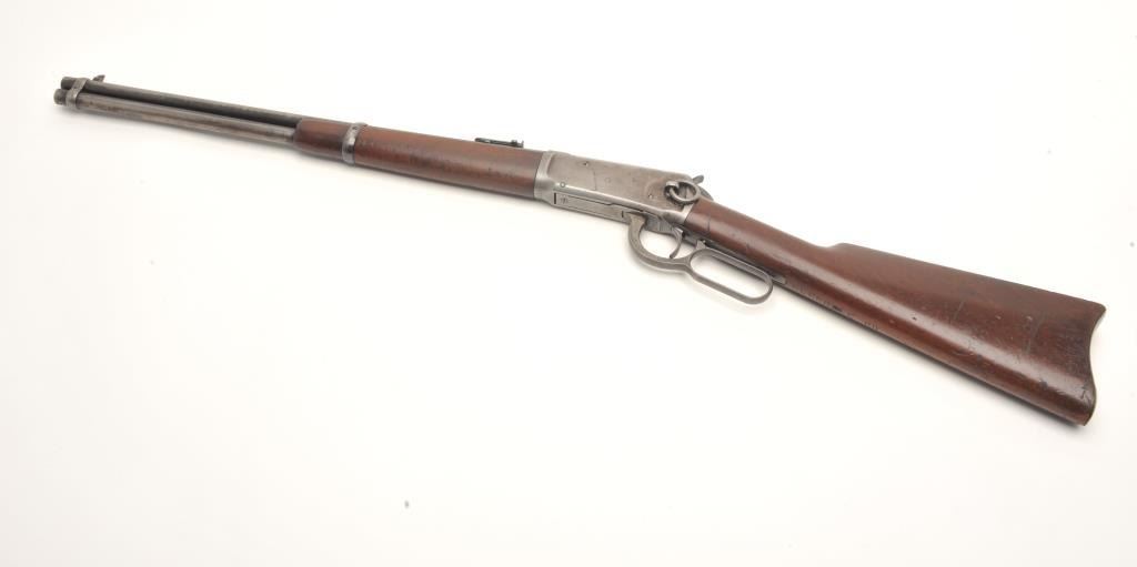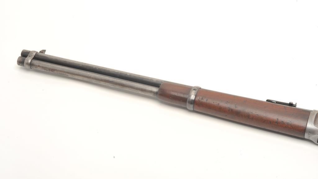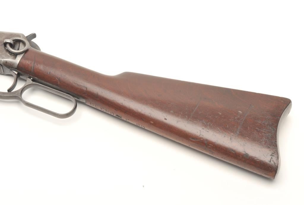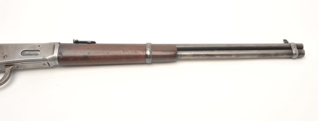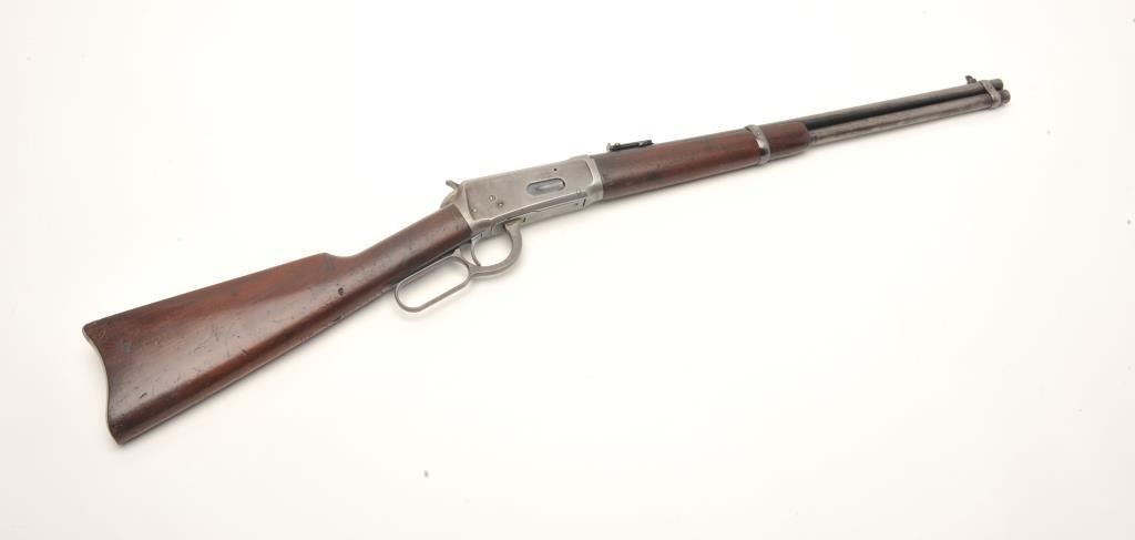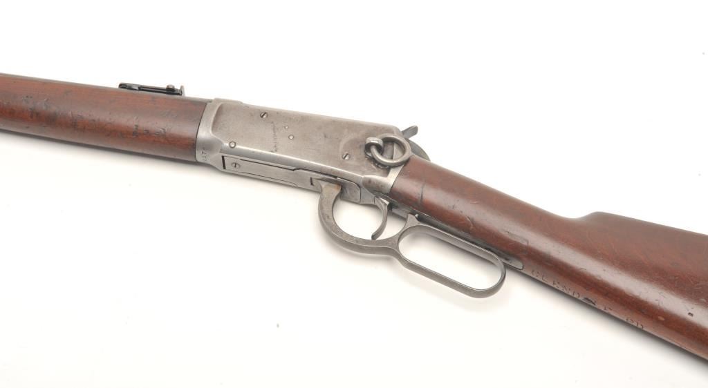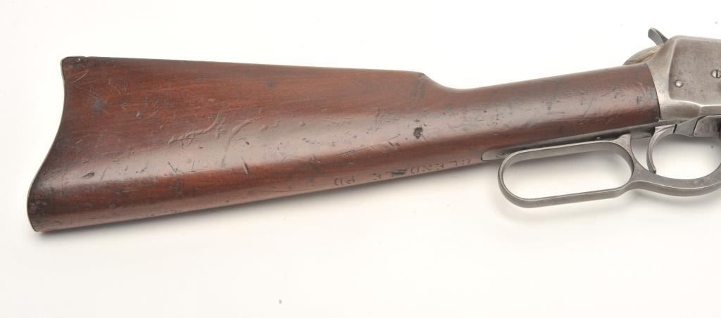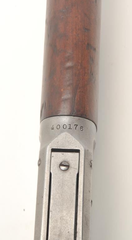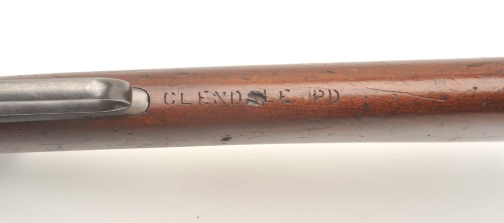 Winchester Model 94 saddle ring carbine, 30 W.C.F. caliber, serial #400176. The carbine is in good overall condition with a 20” round barrel with a blade front and ladder rear sights. The barrel and full-length magazineretain significant blued finish particularly in the protected areas. The remainder has gone to silver/grey patina with some light pin prick pitting. The receiver has gone almost entirely grey with a small amount ofblue around the saddle ring, under the lever and on the hammer. The smooth gumwood stocks are in good condition with mars, dents and compressions. The butt stock ends with a smooth, steel crescent butt plate. Theunderside of the buttstock is marked, “GLENDALE PD”. The bore is good, the action crisp and markings are sharp on this police marked carbine circa 1906. (C+R) Est.: $600-$1,200.