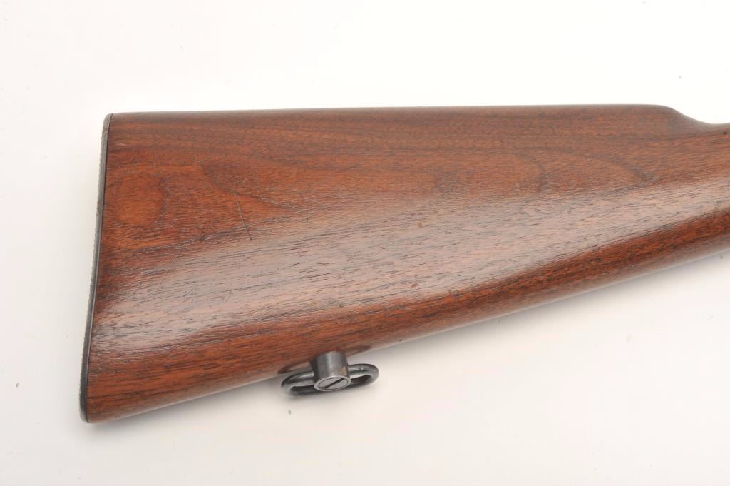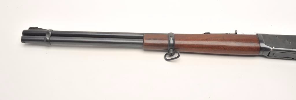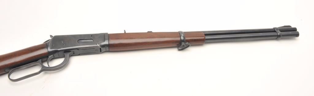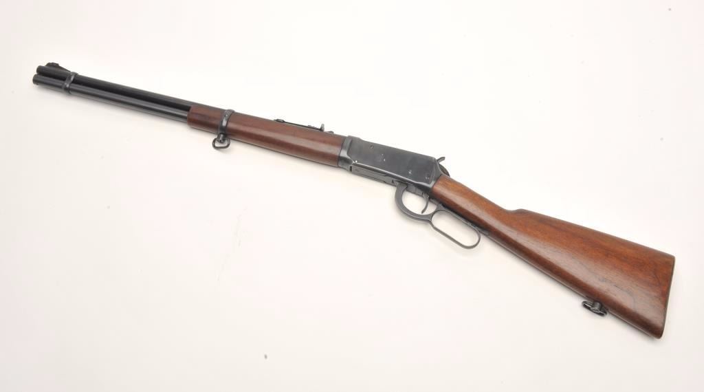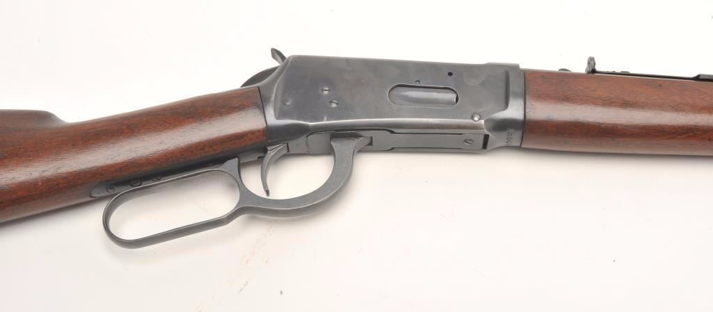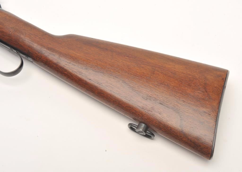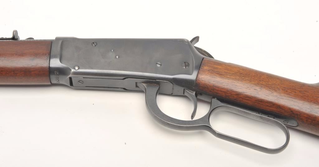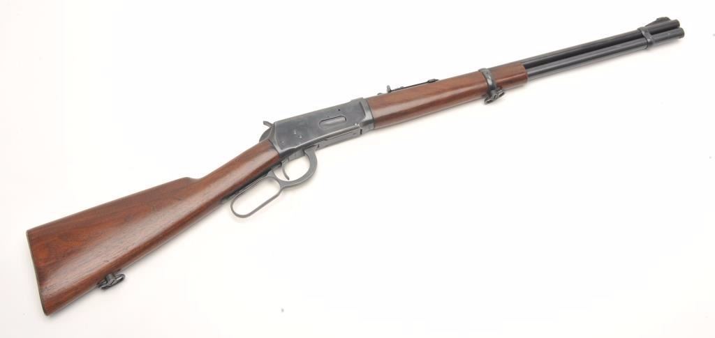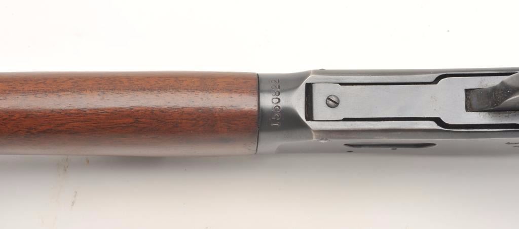 Winchester Model 94 lever action rifle, 30 W.C.F. caliber, serial #1550822. The rifle is in very good overall condition with a 20” round barrel with a ramp front and adjustable rear sights. The barrel, full-lengthmagazine and receiver retain the majority of their muted blue finish with high point edge wear and a loss of finish at the muzzle. The smooth wood stocks are in very good condition with only light storage marks. The butt stock ends with a checkered steel butt plate. The bore is good, the action crisp and markings are sharp on this desirable Winchester circa 1948. (C+R) Est.: $400-$800.