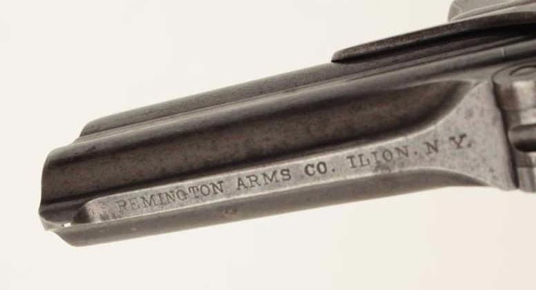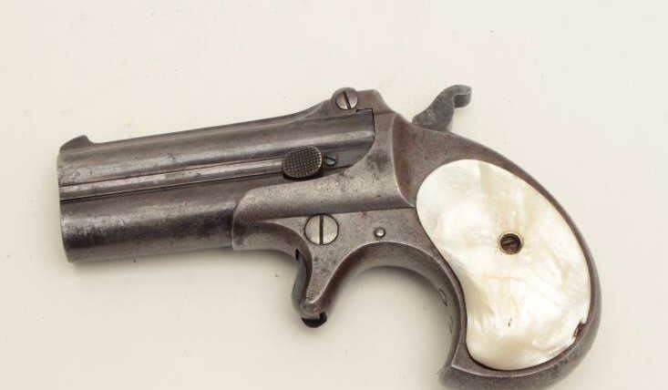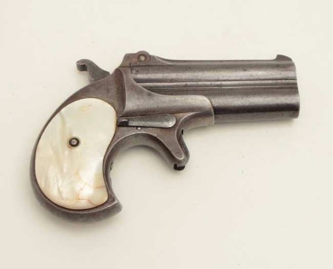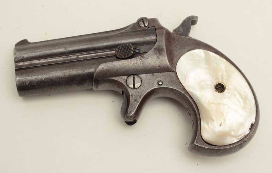 Remington O/U derringer, .41 caliber, 3” barrels, blued finish, pearl grips, S/N 361, in overall good to very good condition displaying areas of original blue on the barrel assembly, good action and markings,bores are fair, grips are good displaying beautiful iridescent colors, small edge chip on bottom back of left grip. (Antique). Est.: $400-$800.