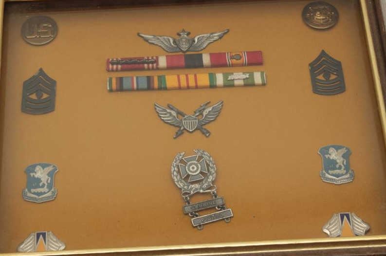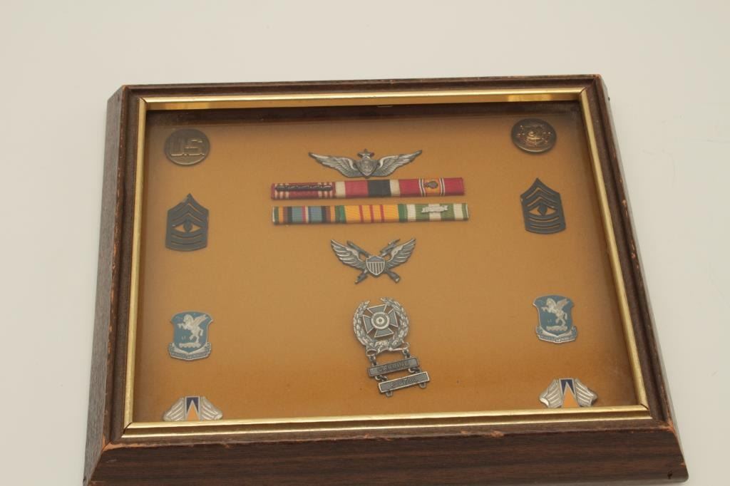 Framed U.S. military ribbons, pins and medals from the Vietnam War with detailed information on the back side of the frame including the notation “1st Aviation Brigade arrived 25 May 1966 flying in support of U.S. and Allied Forces. The Brigade conducted missions as varied as tactical combat assaults, direct fire support, aerial recon, med. Evacuations, troop lift cargo and evac. And relocation of Vietnamese civilians in the Rural Development Programs. Est.: $50-$75.