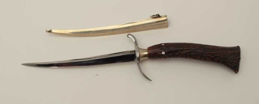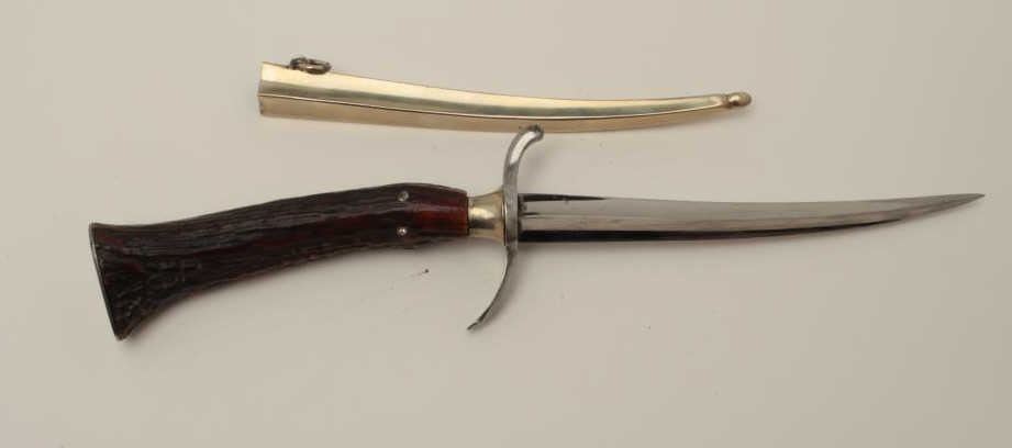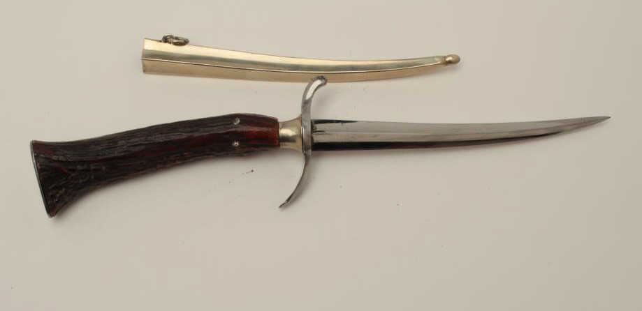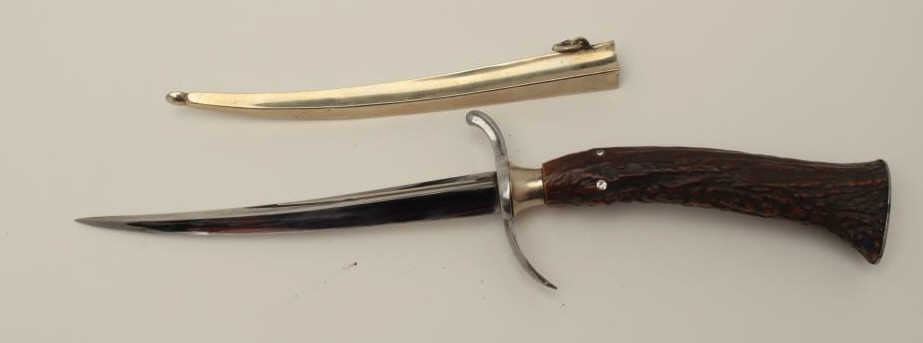 Lot 1114 European 19th century piercing dagger with 4 sided blade, horn grip and nickel silver scabbard. Me