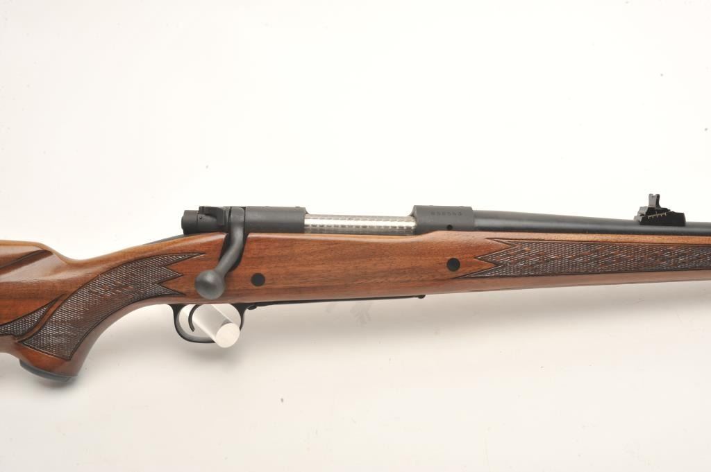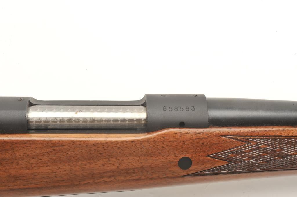 Winchester Model 70 bolt action rifle, 7mm Rem. Mag. caliber, 24” barrel, mat black finish, checkered wood stock, Winchester hard rubber butt pad, S/N 858563, in overall fine condition displaying the majority of itsoriginal finish, fine bore, action, markings and wood. (Modern). Est.: $300-$600.