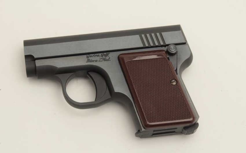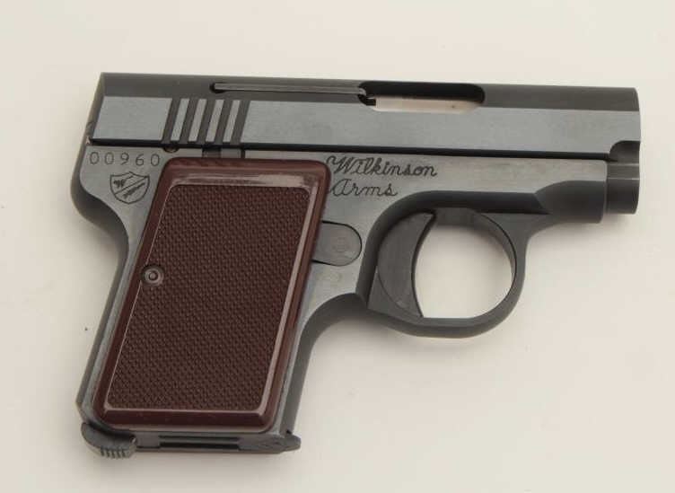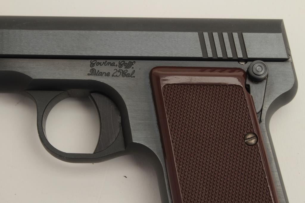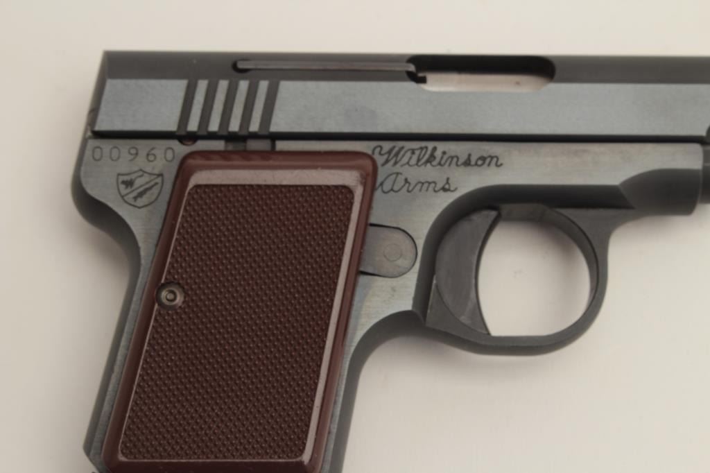 Rare Wilkinson Arms Diane Model semi-automatic pocket pistol, .25 caliber, 2” barrel, blued finish, checkered brown grips, S/N 00960, in like new condition. (Modern/PPT). Est.: $250-$500.
