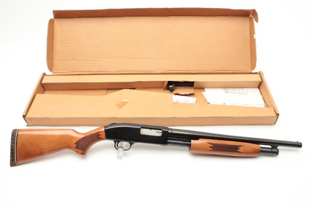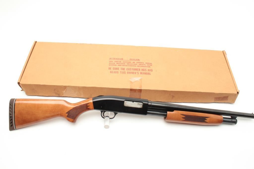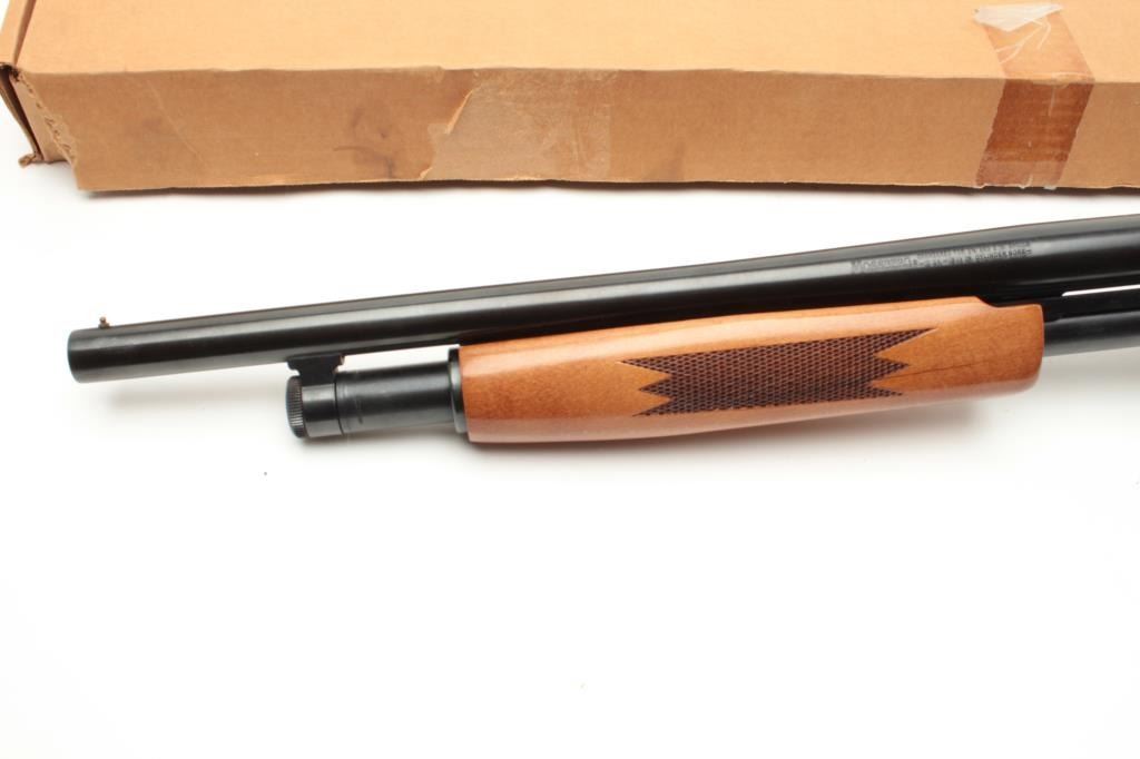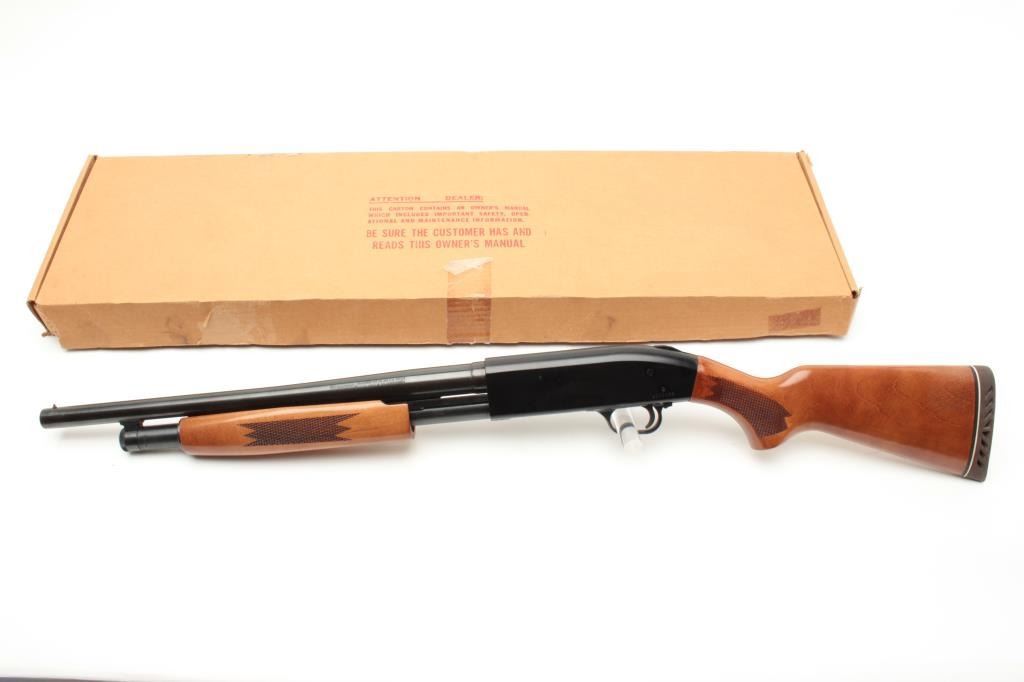 Mossberg Model 500A pump action shotgun, 12 gauge, 18.5” barrel, blued finish, checkered wood stocks, S/N L100369, with extra 28” barrel, factory cardboard box and instructions manual; in overall finecondition showing minimal use or handling. (Modern). Est.: $200-$400.