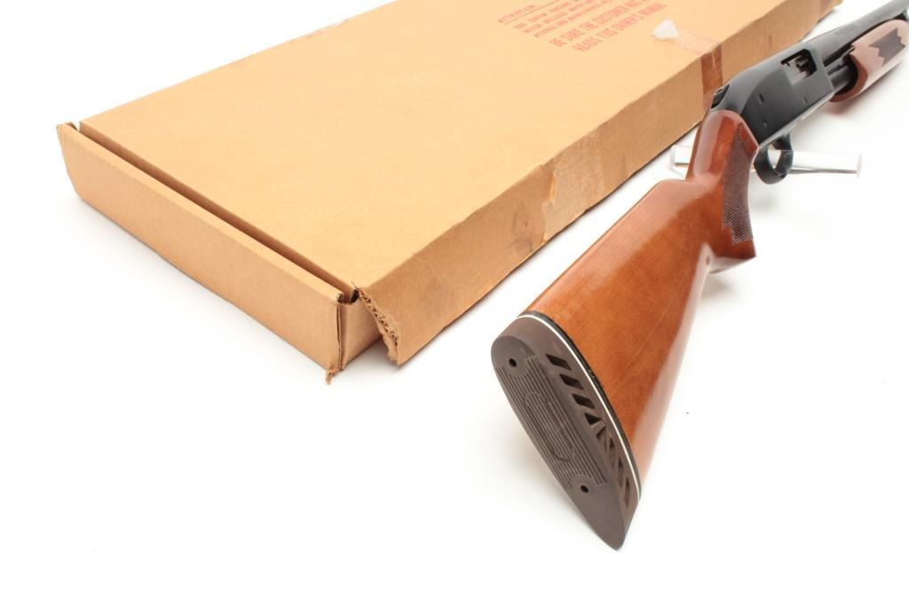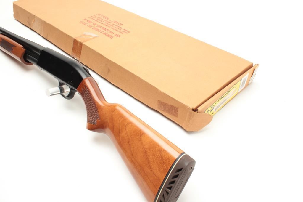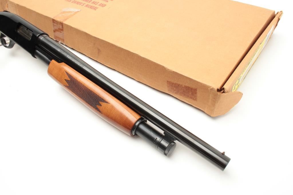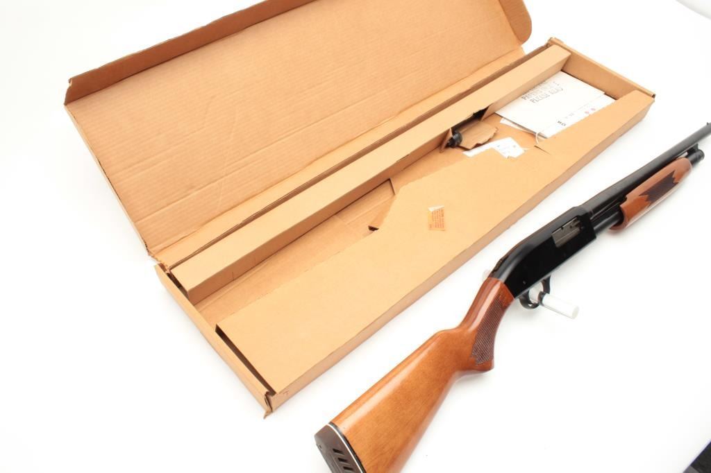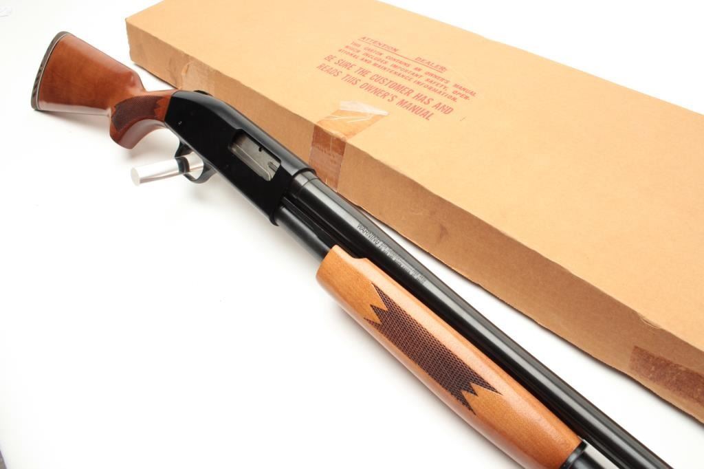 Mossberg Model 500A pump action shotgun, 12 gauge, 18.5” barrel, blued finish, checkered wood stocks, S/N L100369, with extra 28” barrel, factory cardboard box and instructions manual; in overall finecondition showing minimal use or handling. (Modern). Est.: $200-$400.