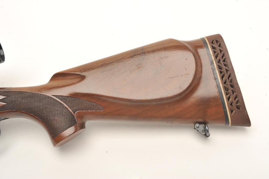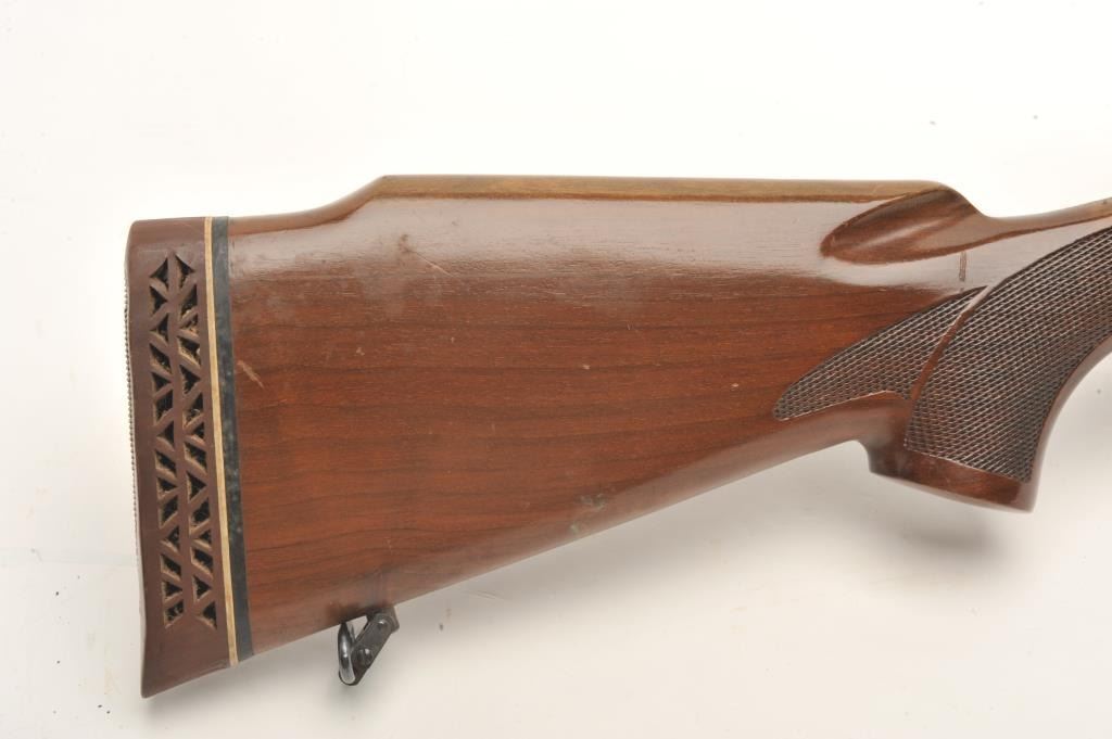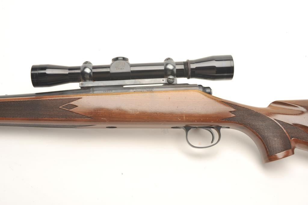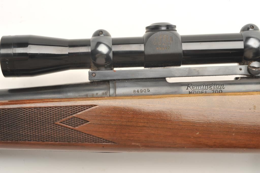 Remington Model 700 bolt action rifle, 6 mm Remington caliber, serial #84905. The rifle is in good overall condition with a 20” barrel. The barrel and receiver retain nearly all of their polished blue finish with the front and rear sights having been removed. The checkered wood stock is in good condition with small mars, scratches and some bubbling of the finish on the cheek piece. The butt stock has been shortened,sling swivels added and ends with a White Line ventilated rubber pad and 12 ½” LOP. The bore is rusted; the action functions and markings are legible. The rifle is topped with a Buehler one-piece mount and Leupold M7 fixed 4x scope with clear, crisp optics. (Modern) Est.: $400-$800.