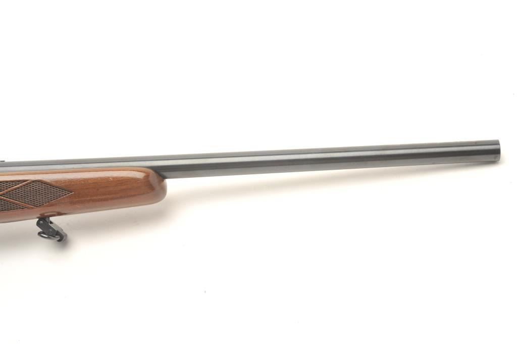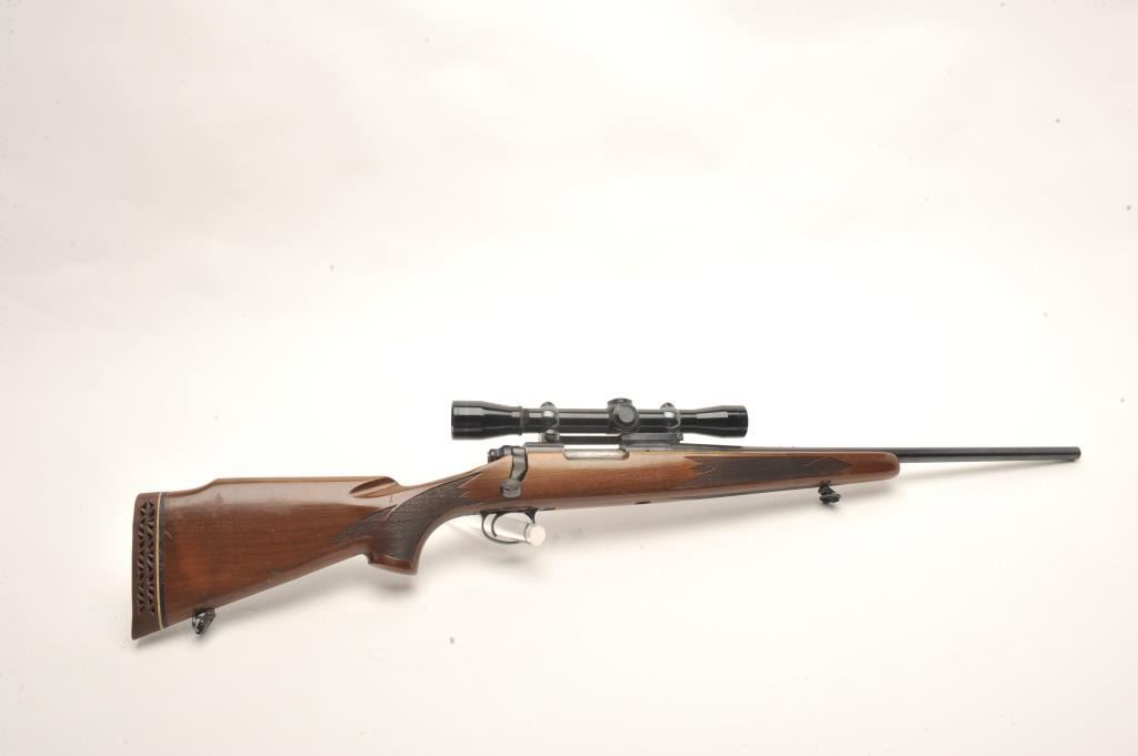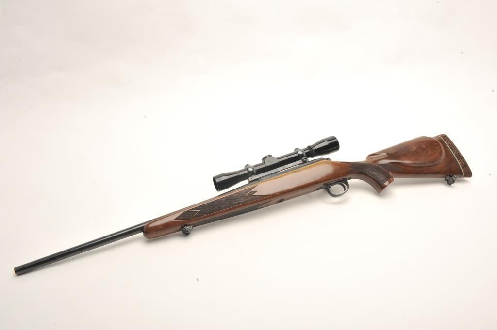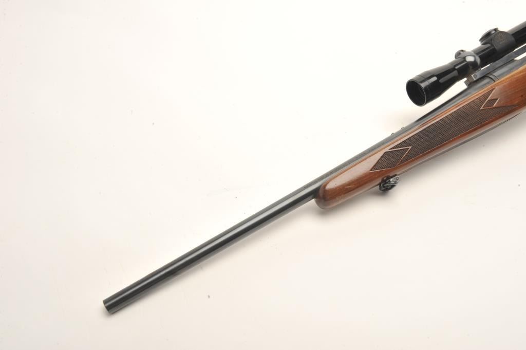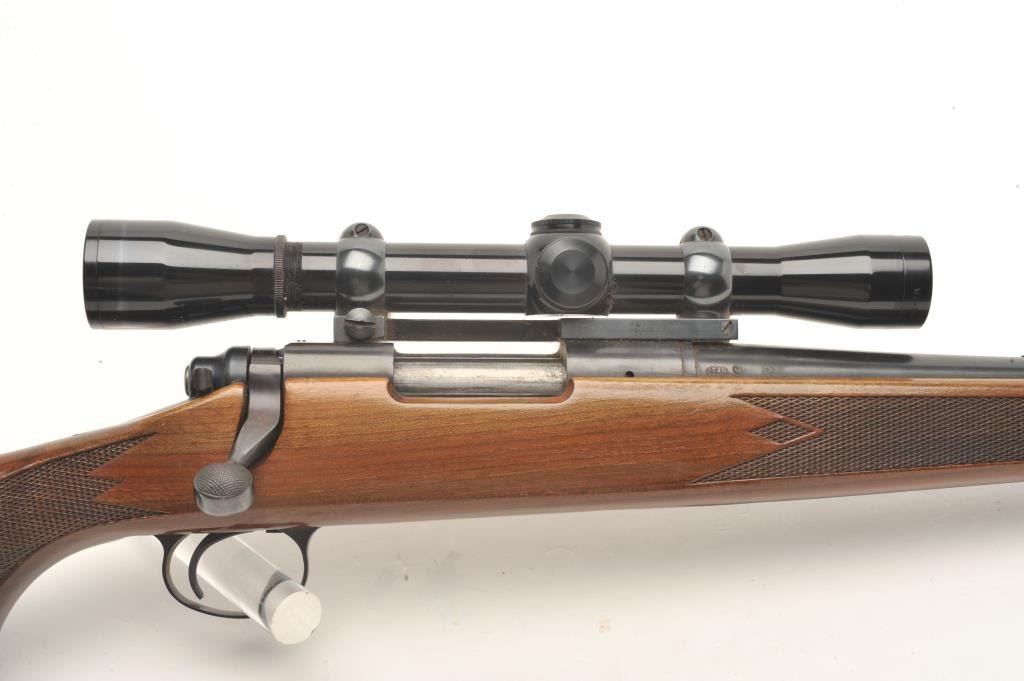 Remington Model 700 bolt action rifle, 6 mm Remington caliber, serial #84905. The rifle is in good overall condition with a 20” barrel. The barrel and receiver retain nearly all of their polished blue finish with the front and rear sights having been removed. The checkered wood stock is in good condition with small mars, scratches and some bubbling of the finish on the cheek piece. The butt stock has been shortened,sling swivels added and ends with a White Line ventilated rubber pad and 12 ½” LOP. The bore is rusted; the action functions and markings are legible. The rifle is topped with a Buehler one-piece mount and Leupold M7 fixed 4x scope with clear, crisp optics. (Modern) Est.: $400-$800.