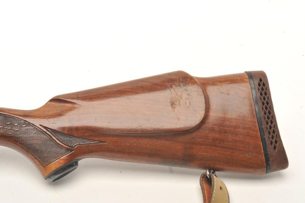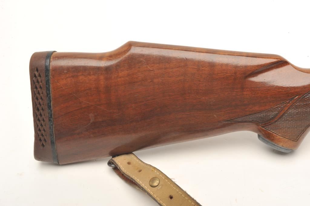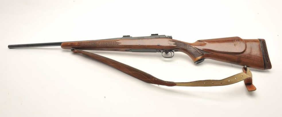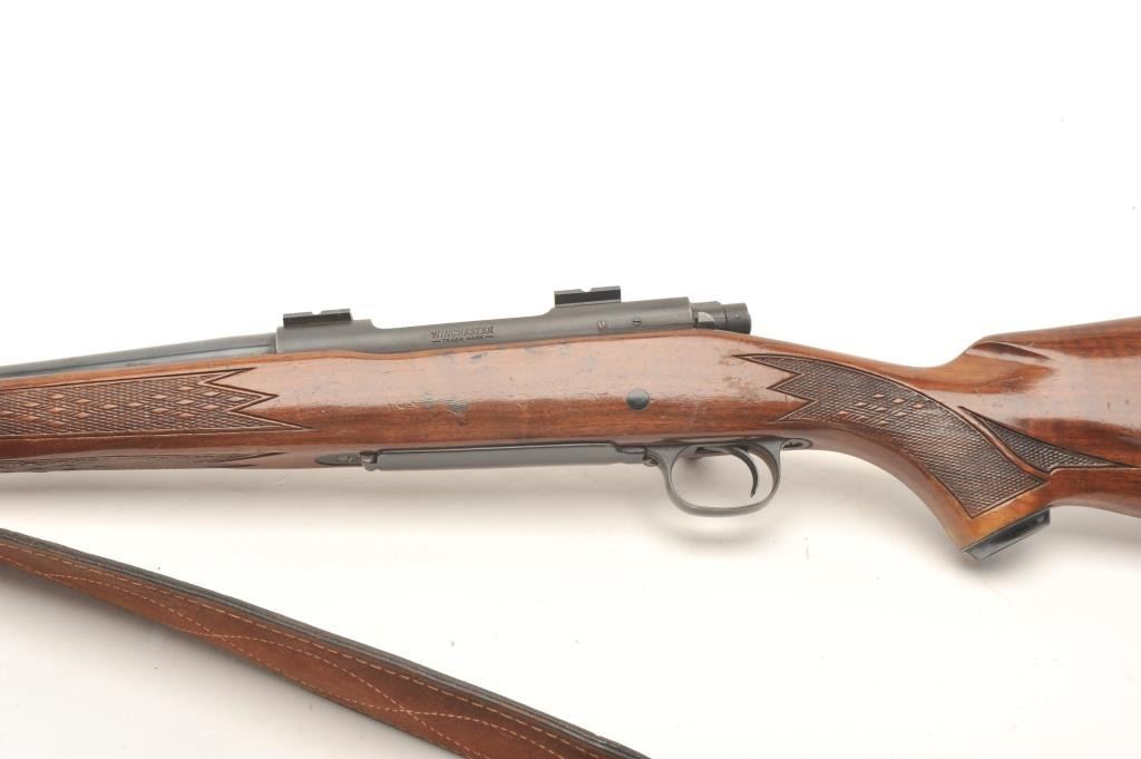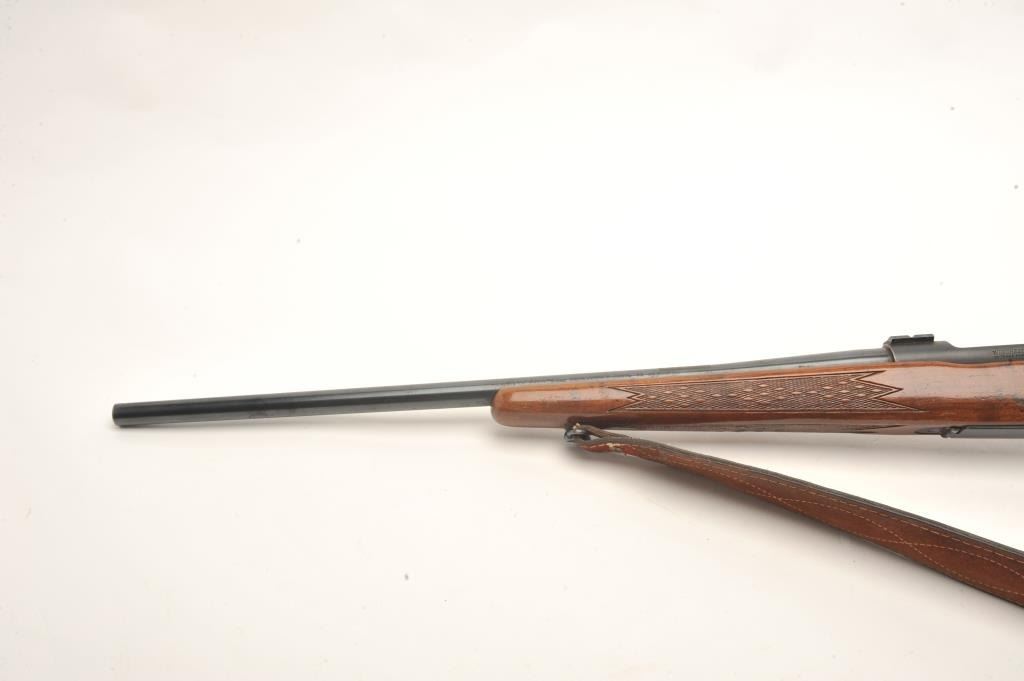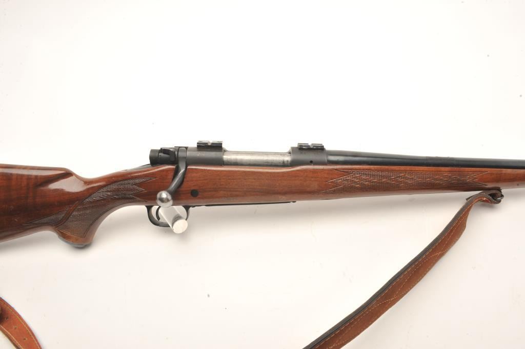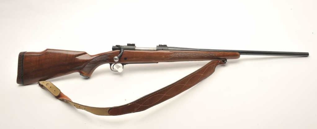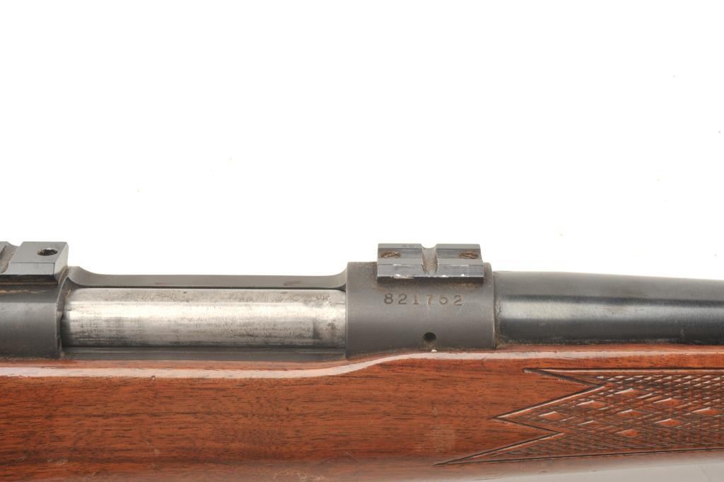Winchester Model 70 bolt action rifle, 30/06 caliber, serial #821752. The rifle is in good overall condition with a 22” barrel with front and rear sights removed. The barrel and receiver retain the majority of theirblued finish with scrapes and scratches noted. The checkered wood stock is in good condition with small mars and scratches. The butt stock includes sling swivels and a leather military style sling and ends with apoorly fitted ventilated rubber pad. The bore is dirty and may clean to good, the action crisp and markings are sharp. The rifle is topped with Weaver two-piece bases. (C+R) Est.: $250-$500.