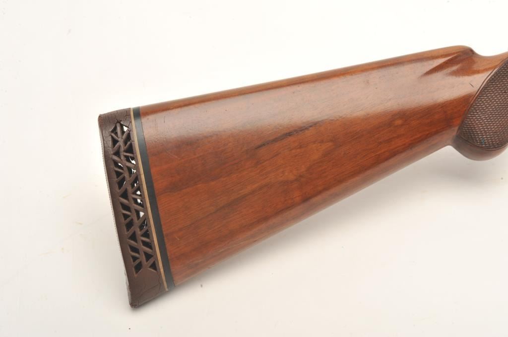 J.P. Sauer & Sohn side by side hammer shotgun, 16 gauge, serial #NSNV. The shotgun is in very good overall condition with 26” barrels with a full-length filed rib and brass bead front sight. The Krupp steelmarked barrels retain the majority of their blued finish. The receiver shows significant muted case colors with tasteful scroll engraving and exposed hammers. The finely checkered wood stock is in good conditionshowing wear and use with a beavertail fore end and Prince of Wales pistol grip. The butt stock ends with a White Line ventilated rubber recoil pad providing a 14 ¾” LOP to the front trigger. The bores are good, theaction crisp and markings are sharp on this fine, Sauer side by side hammer gun. (C+R) Est.: $300-$600.